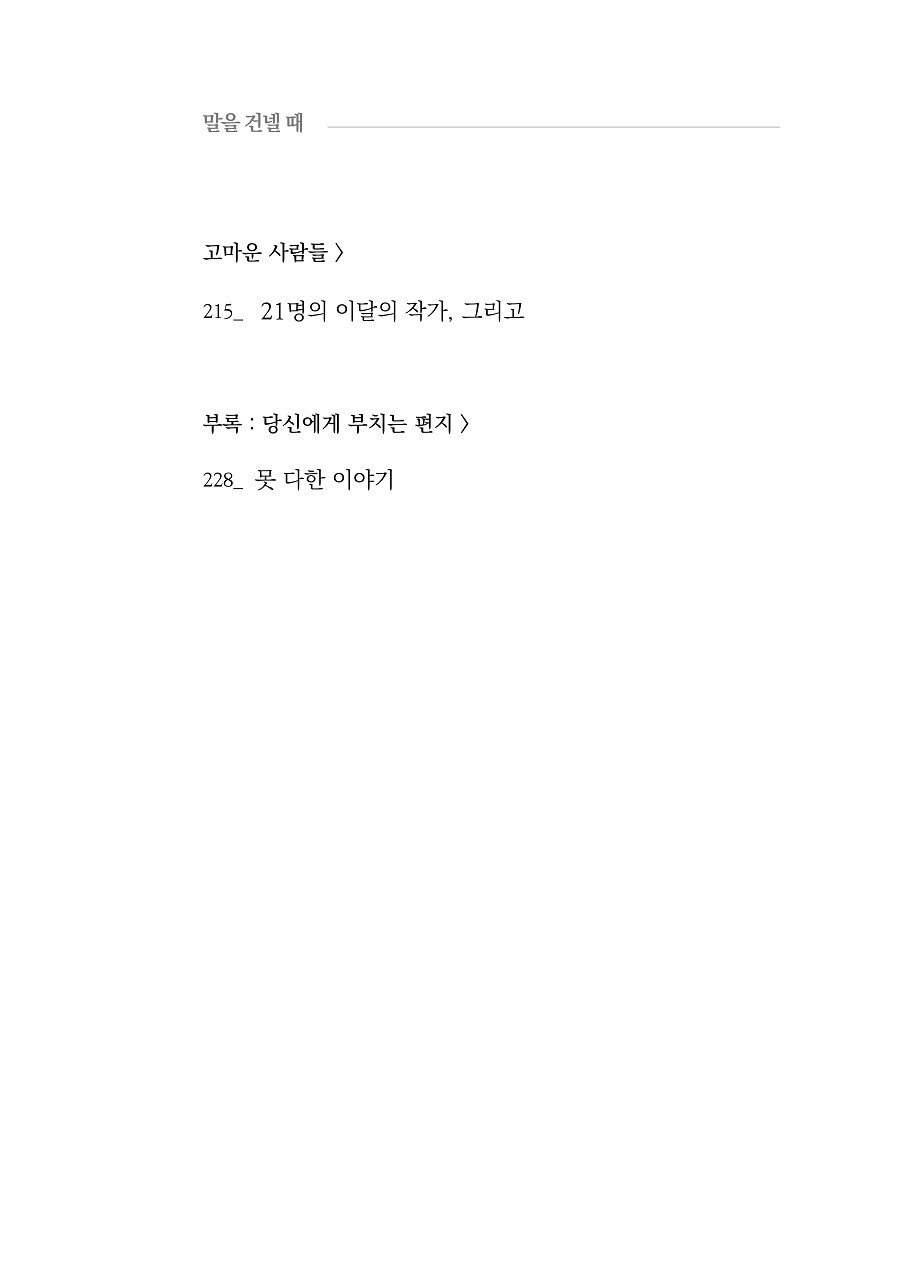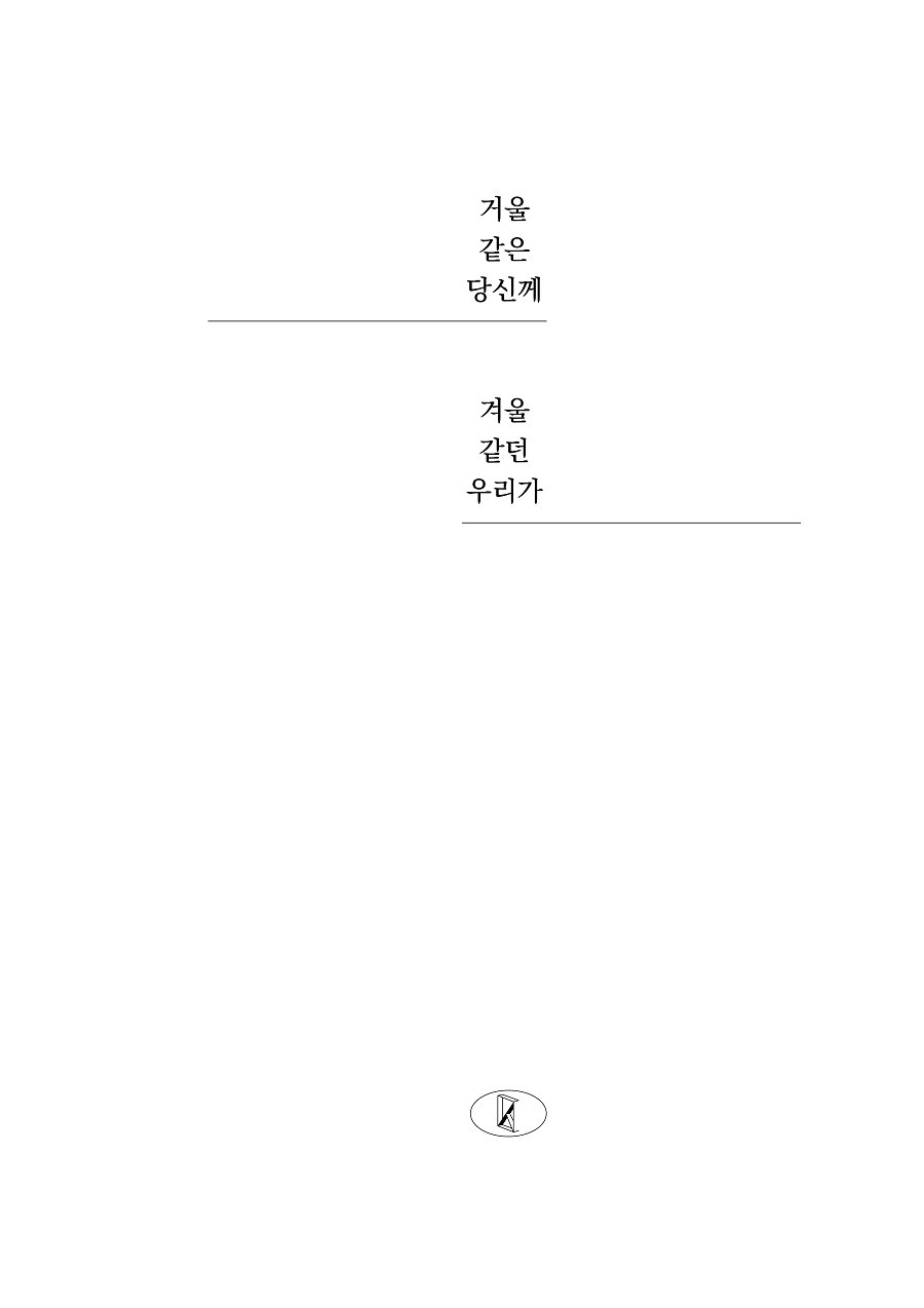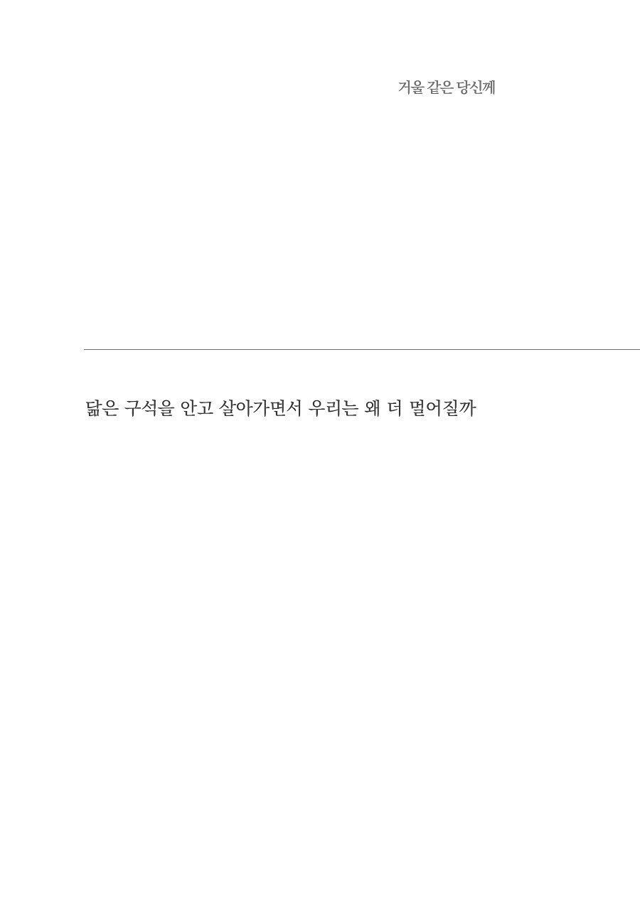 책 <거울 같은 당신께 겨울 같던 우리가>는 문장과장면들의 비정기적 프로젝트 [이달의 장르]의 첫 단행본으로, 기획자 가랑비메이커와 독립출판 작가 기영석, 임나운, 박수진, 박지수, 주예슬 등을 비롯한 21명의 작가진이 함께 자유롭게 참여하였습니다.