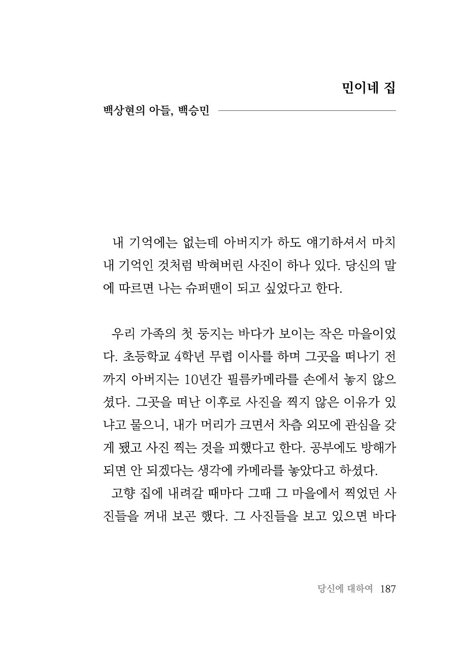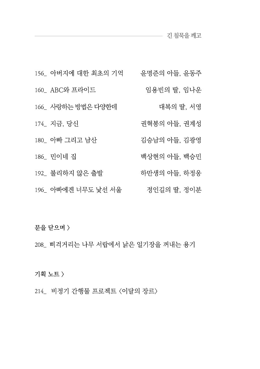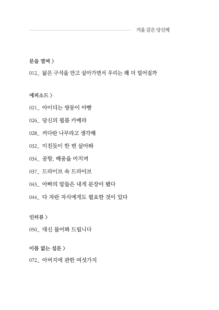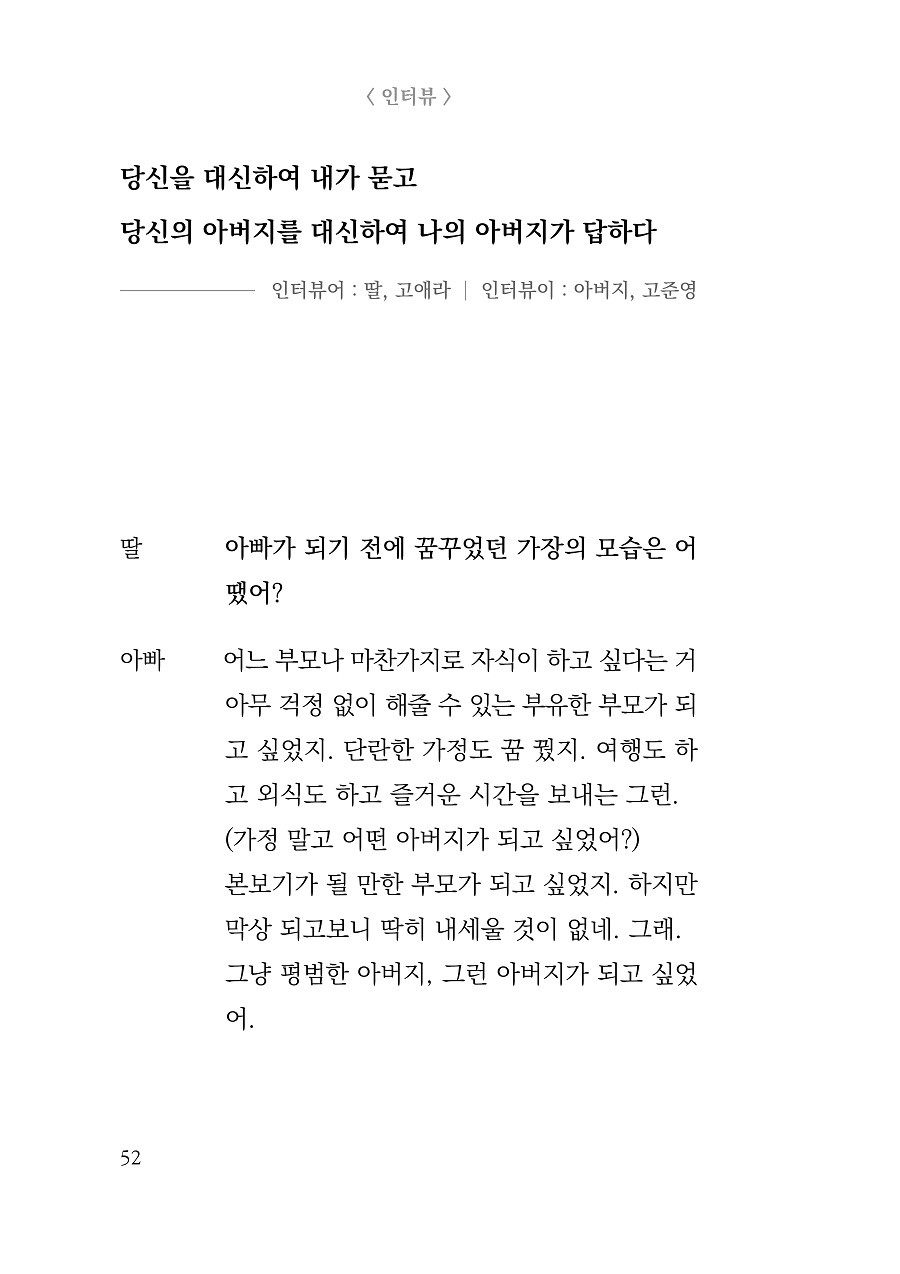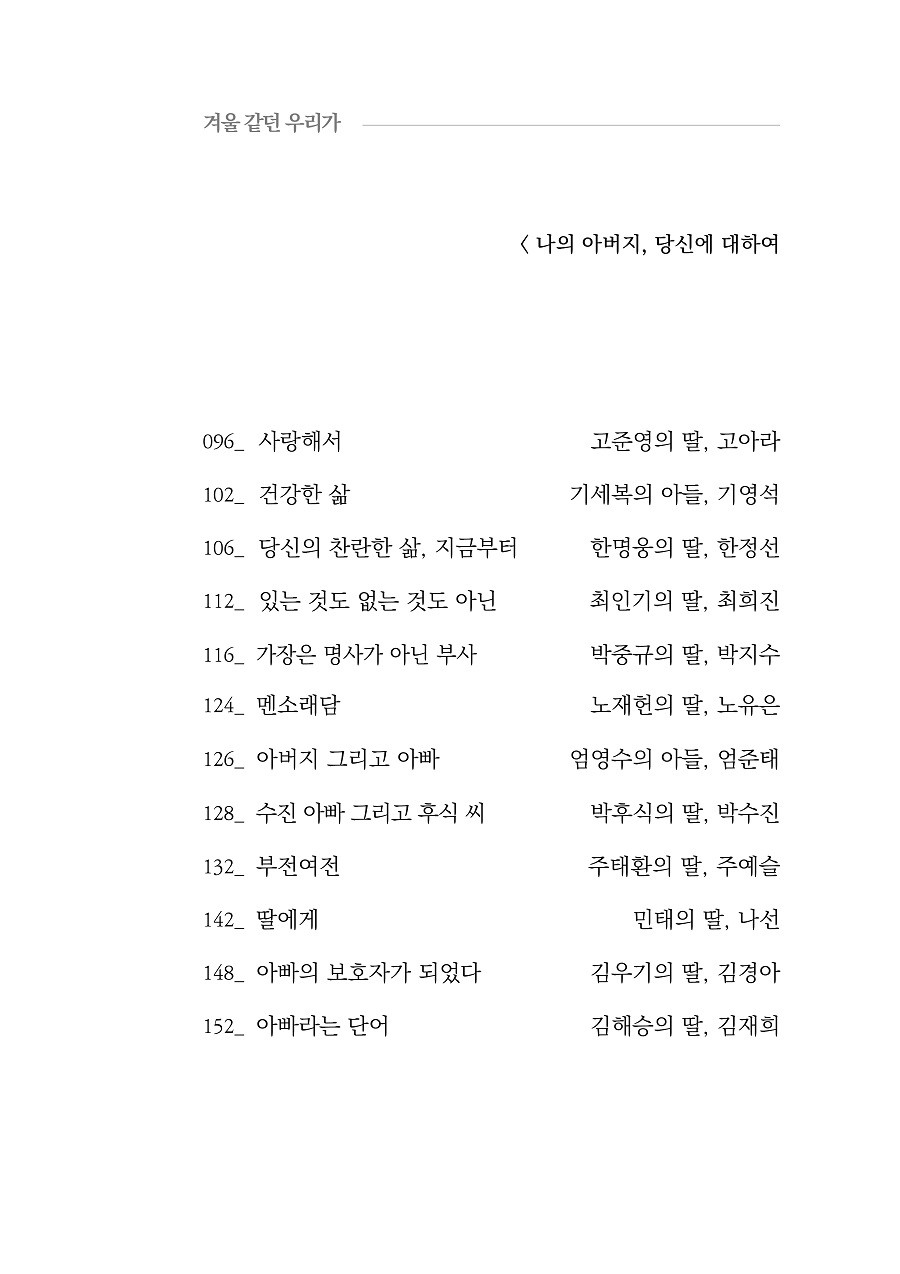 에세이, 시, 소설, 만화, 인터뷰, 설문. 우리는 서로 다른 시선과 방식으로 아버지를 옮겨두었다. 여전히 서툴고 부족한 마음일 테지만 그 모두가 당신을 사랑하는 마음이라는 것을 이해해줄 당신을 알기에, 우리는 한 권의 이야기를 맺을 수 있었다.