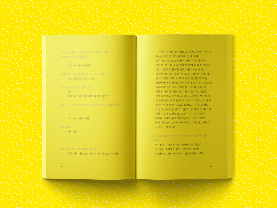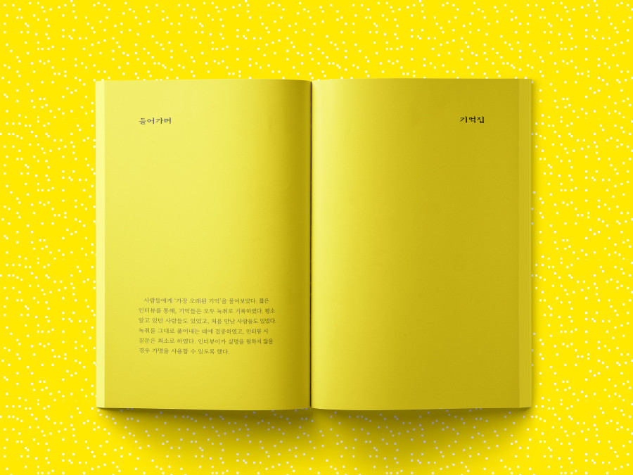 사람들에게 가장 오래된 기억을 물어봤습니다. 그 기억을 모아 책으로 만들었습니다. 짧은 인터뷰로 모은 기억을 정리한 책입니다. 인터뷰 형식으로 정리되어있고, 저의 짧은 글도 들어있습니다. 녹취로 기록한 책인 만큼, 녹음본을 그대로 풀어내는데에 집중했습니다. 인터뷰에 참여해주신 분들은 모두 좋은 분들입니다. 저의 무례한 부탁을 선뜻 들어주신 아주 친절한 분들입니다. 좋은 분들의 이야기가 담긴 책이므로, 좋은 책이라고 생각합니다.