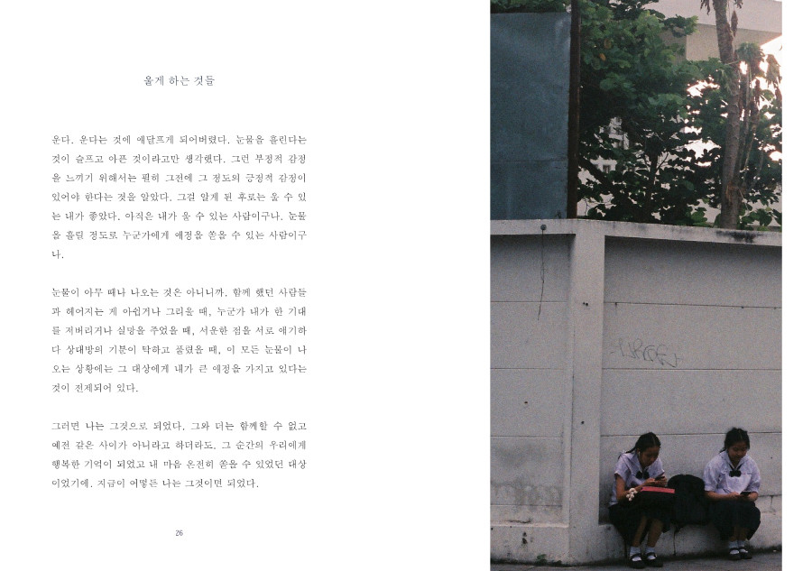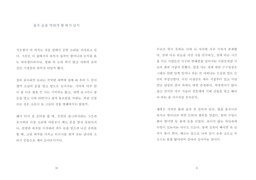 아무 데나 툭 하고 앉아 멍하니 물결을 바라볼 때가 잦았습니다. 그러다 위아래로 요동치며 빠르게 흘러가는 물결이 지나간 삶같다 느꼈습니다. 파도를 타듯 환희를 느끼는 순간도, 잠수하듯 한없이 가라앉는 순간도 있었기에. 지난 시간이 멀리 흘러가 보이지 않기 전에 그들이 어떤 형태를 가지고 있었는지 찬찬히 곱씹어 보고 싶었습니다.