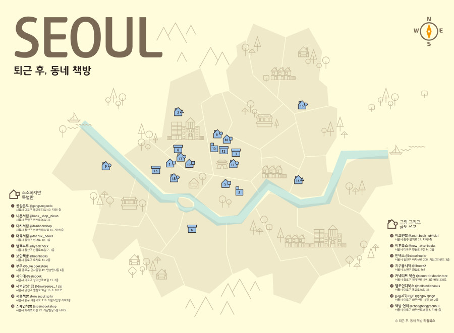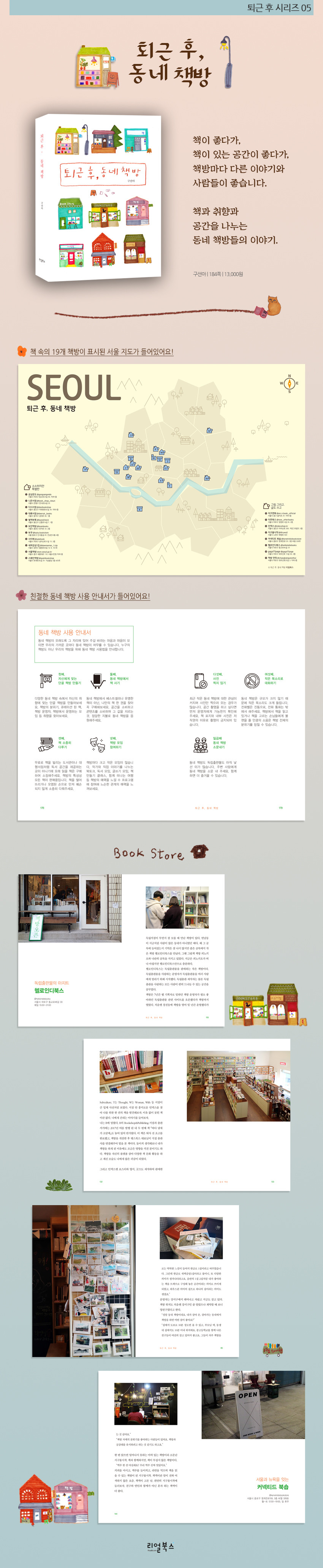 * 책 속에 19개 책방이 표시된 커버 형 서울 지도 수록되어 있습니다.