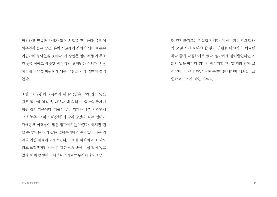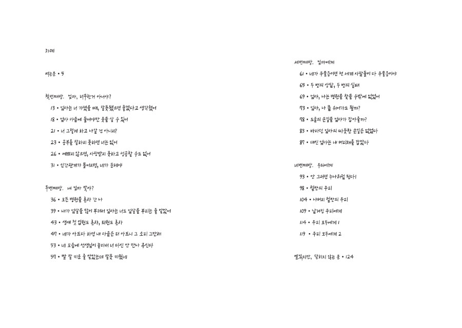 이 글이 내 머릿속의 지우개 역할을 해 주었으면 좋겠다고 생각했습니다. 엄마에게는 남아있지 않은 말들이 저에게도 남아 있지 않기를 매일 생각하며 글을 썼습니다.