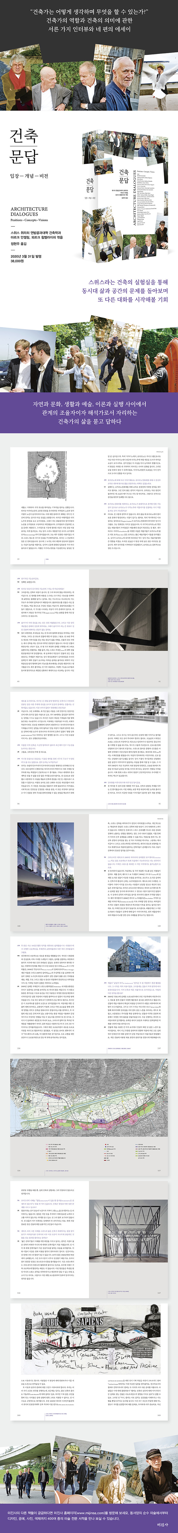 건축은 텍스트나 도안에 담겨 아이디어로 제시될 뿐 아니라 실제로 삼차원의 공간을 만들어낸다. 더욱이 오늘날 공간은 점, 선, 면으로 이루어지는 물리적, 시각적 차원을 넘어 전자파와 광선, 대기, 음향, 냄새 등 보이지 않는 물질로 채워진 미정형의 차원과 연관된다. 건축은 풍토와 문화, 라이프 스타일, 보전과 발전에 대한 사회의 가치 체계 및 법률과 정치 현안에 직결되어 상호 간 영향을 주고받기도 한다. 『건축 문답』에는 이렇듯 삶의 다양한 요소들과 연결된 건축의 의미를 이해하고 건축가의 역할을 헤아리게 하는 30편의 인터뷰와 4편의 에세이가 실려 있다.
