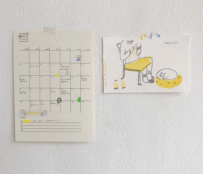 고양이들이 반복되는 1 과 작은 손뜨개 소품들이 함께 그려진 2 버전이 있습니다.