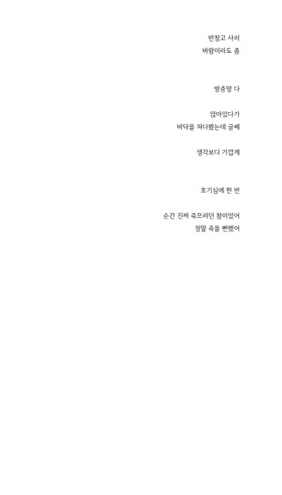 제 책을 읽는 동안은 독자 분들의 자기 싫거나 살기 싫은 마음이 조금이나마 사그라들었으면 하는 마음입니다.