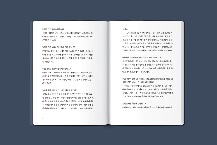 금융인을 꿈꾸는 취업 준비생, 개인 투자자, 현직 금융인도 궁금해하는 질문을 모아 우리 나라 퀀트 전문가 9명에게 심도 있는 질문을 던졌습니다.