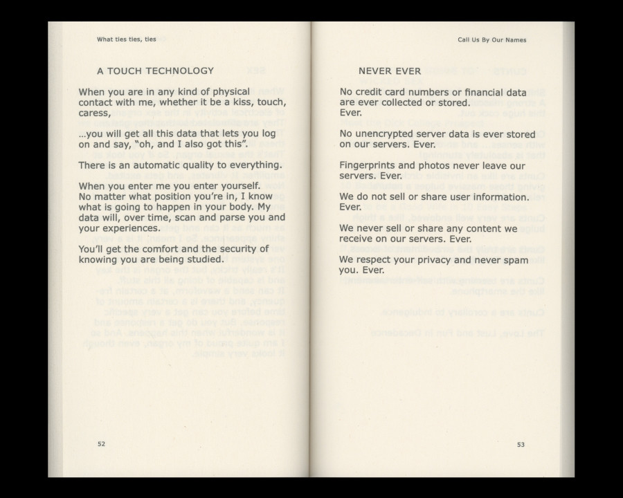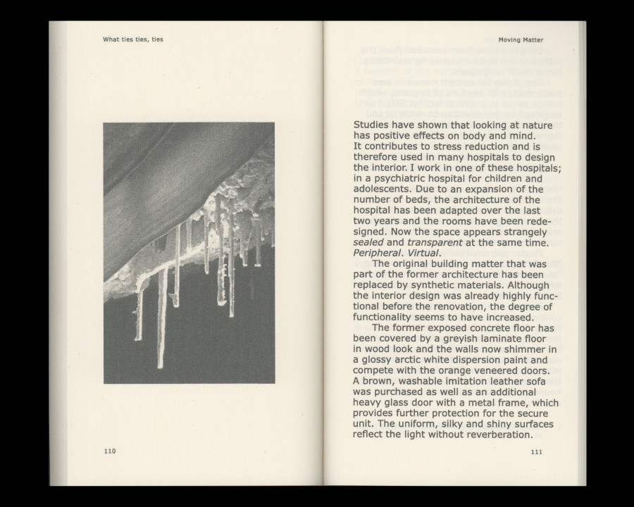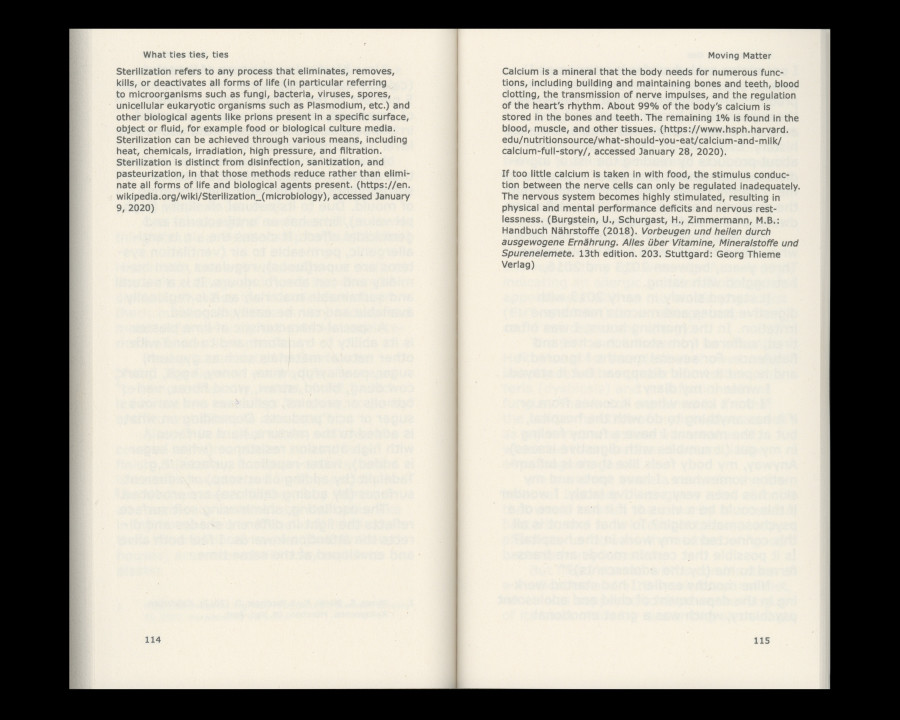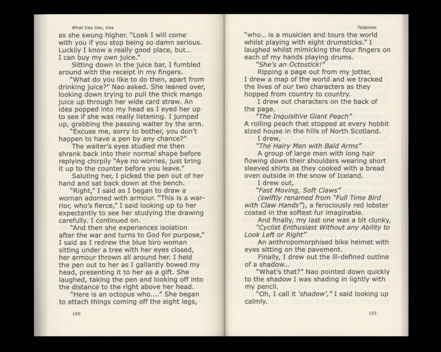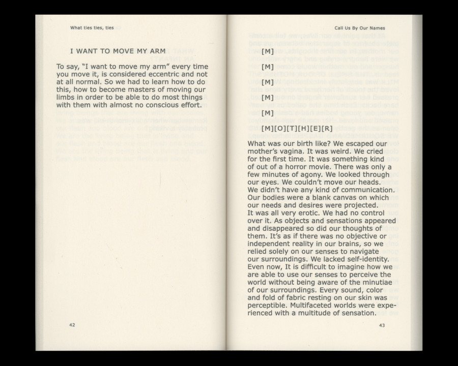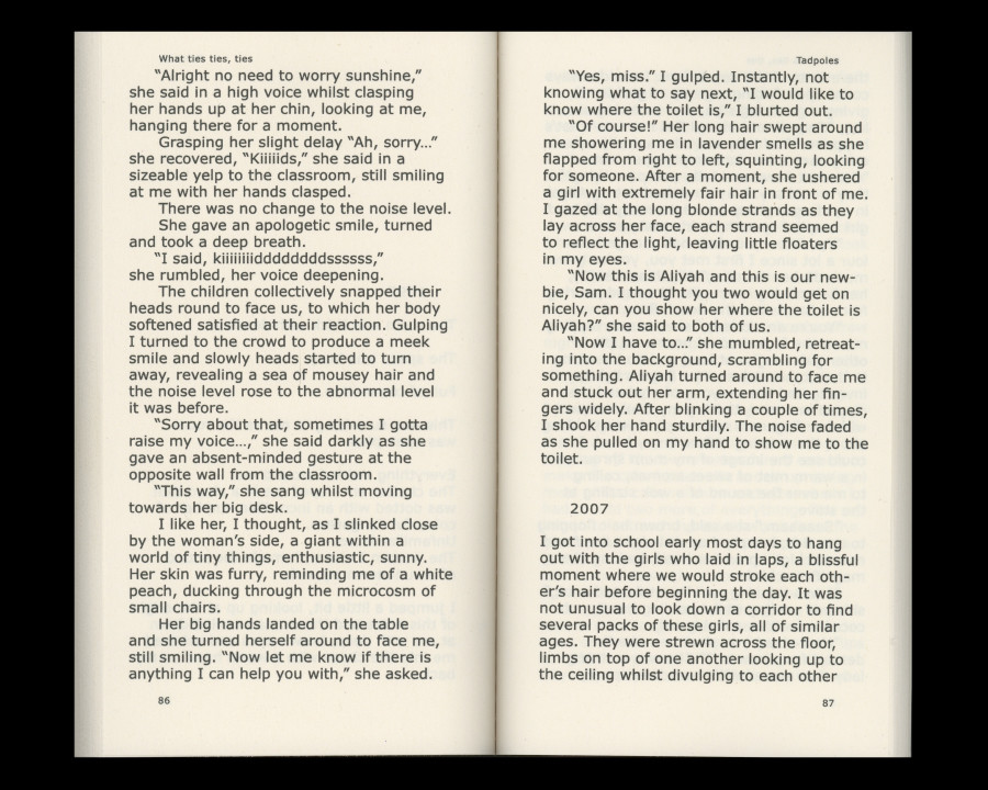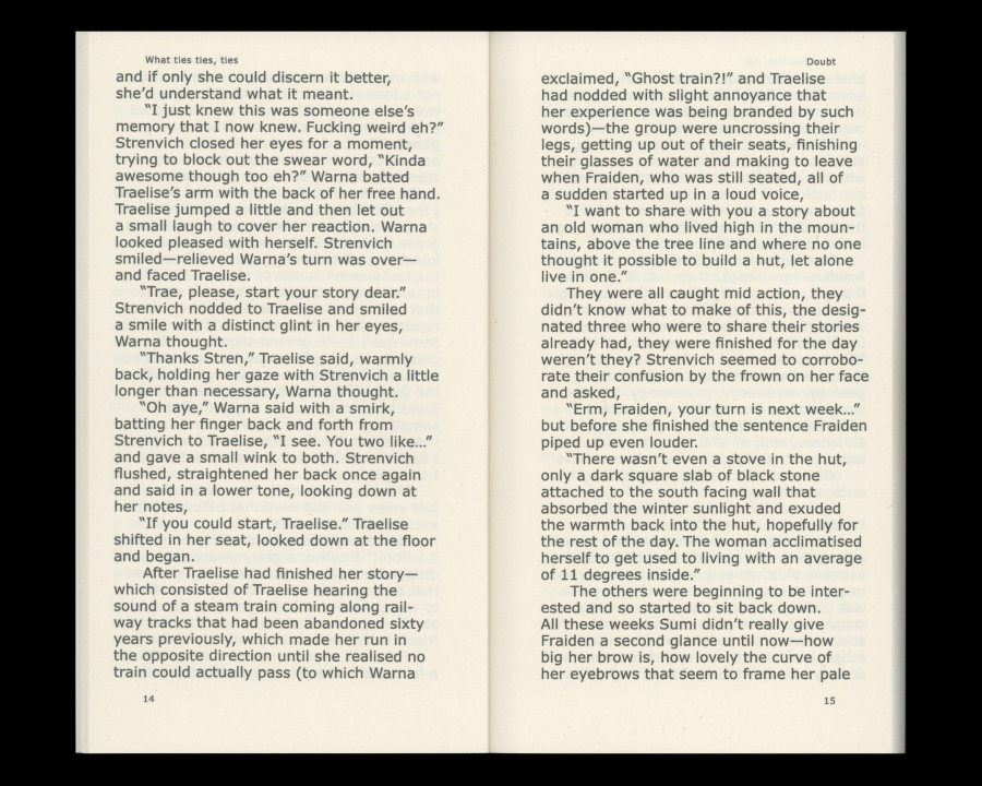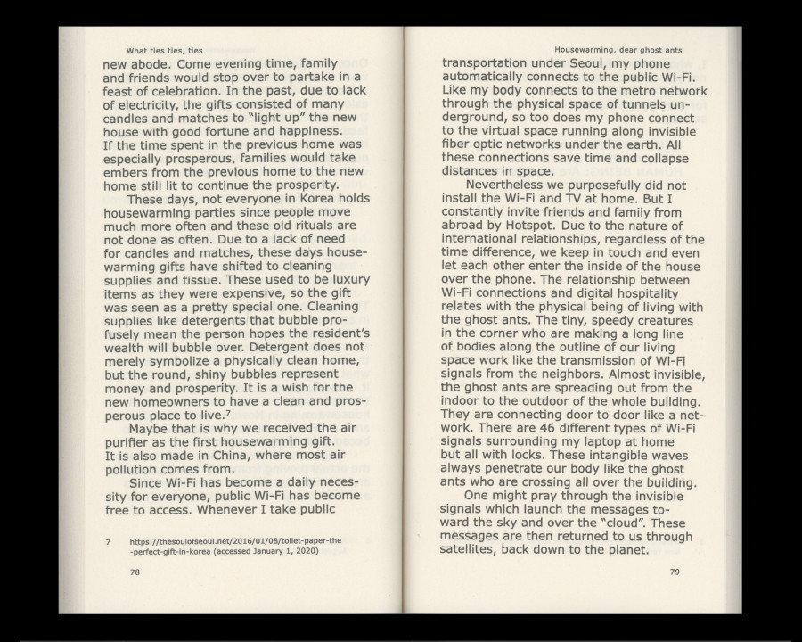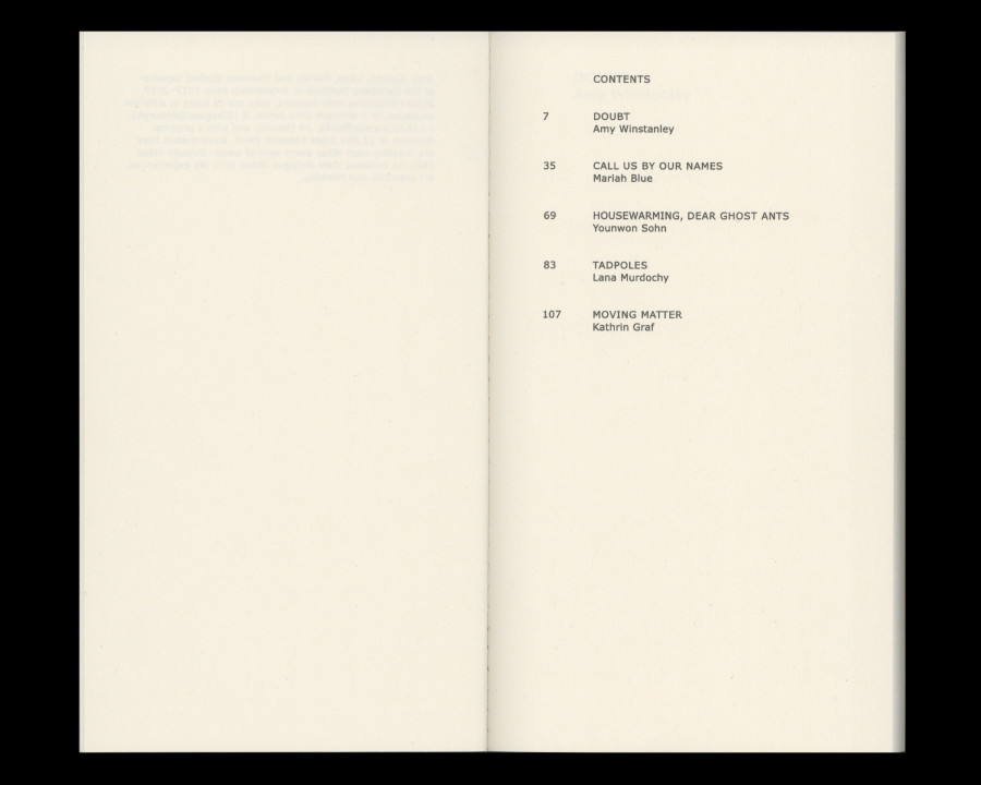 About Book What ties ties, ties is a book created by five artists of different nationalities, backgrounds, ages, and gender identity. This book is tied by ‘Doubt’, a short story about questioning perceptions of the world by Scottish painter Amy Winstanley(b.1983), ’Call Us by Our Names’, poems that are collaboration between Mariah Blue(b.1977) and machine learning algorithm, ’Housewarming, Dear Ghost Ants’, an invitation essay about house, creature, and future scenery by Korean artist Younwon Sohn(b.1990), ‘Tadpoles’, a short coming of age story exploring friendship and imagination of young women by Scottish-Kurdish artist Lana Murdochy(b.1995), and ‘Moving Matter’, an essay about exploring the relationship between feelings and surfaces by German sculptor Kathrin Graf(b.1984).