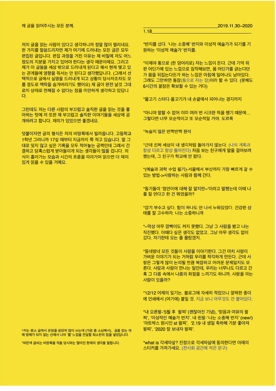 그림을 그리고 글을 쓰고 사진을 찍고.. 각자만의 방식으로, 각자만의 작업을 다채롭게 표출하며 관람자들과 소통한다.