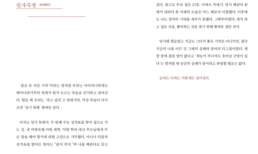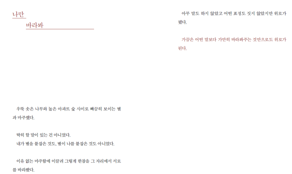소심함과 겁은 덤이었죠. 그러나 서른을 앞두고 자신을 되돌아보는 시간을 가졌어요. 별 생각 없이요. 그때 깨달았어요. 생각을, 고민을 하지 않아도 별 일이 일어나지 않음을요. 매일 매일 그럴 수는 없겠지만, 때로는 '무념무상'하게 살아가도 나쁘지 않겠다는것도요.