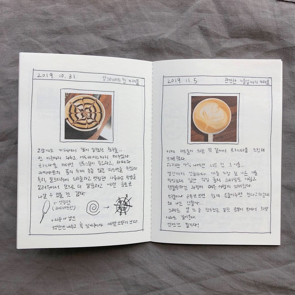 특히 라떼아트에 관심이 많은 저는 제가 라떼아트를 하면서 느낀 점들과 매일의 사진, 약간의 그림설명으로 정리해봤습니다.