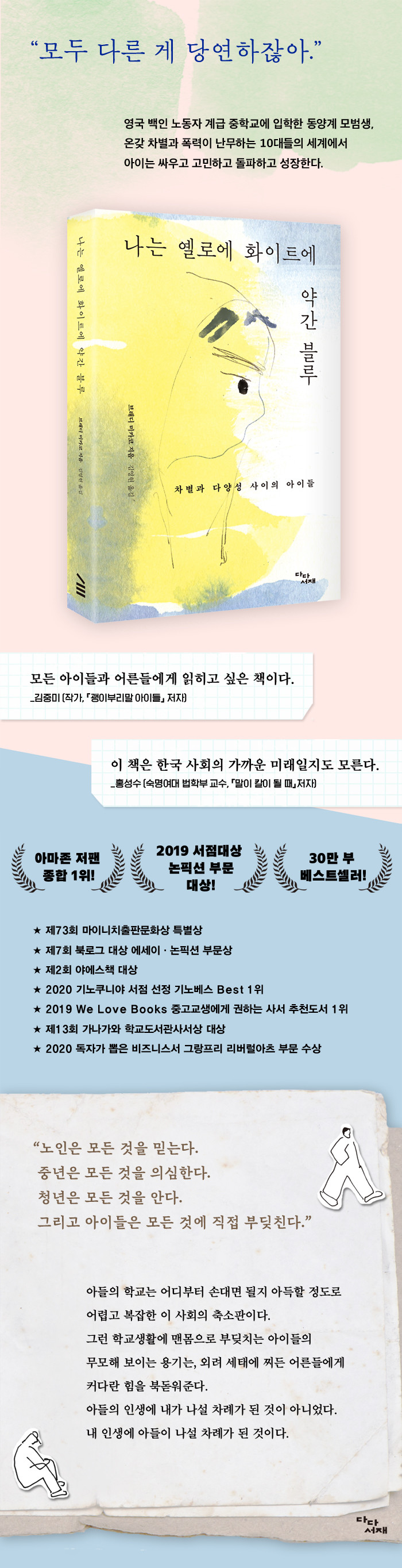 여전히 인종차별이 존재하고, 집단 따돌림은 계속되고, 해진 교복을 입고 학교에 가야 하지만 아이들의 삶은 계속된다. 나와 생각이 달라도, 이해할 수 없어도, 때로는 나를 싫어하는 친구 라해도 인정하고 공존한다. 각종 이슈로 편을 갈라 대립하고 상대파가 존재한다는 것조차 용납하지 못하는 어른들의 세상에서 오히려 아이들은 ‘나와 다른 사람도 있다’는 현실을 냉정하게 받아들이며 살아간다고 저자는 지적한다.
