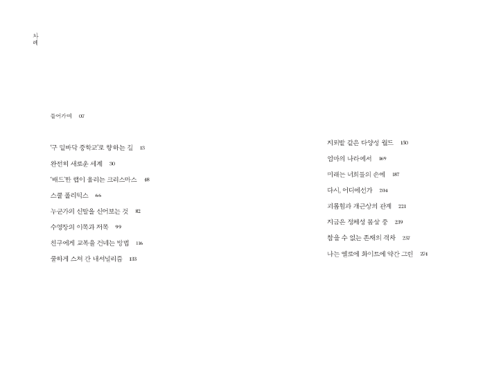 학교는 사회를 비추는 거울이기 때문에 학생들 사이에는 항상 격차가 있을 수밖에 없다. 하지만 그 격차가 확대되는 걸 방치하는 장소에서는 무언가 열기가 느껴지지 않았다. 어둡고 경직 되어서 새롭거나 즐거운 일이 일어날 것 같지 않았다. 그것은 이미 쇠퇴하기 시작한 증거라고 생각한다. _266면
