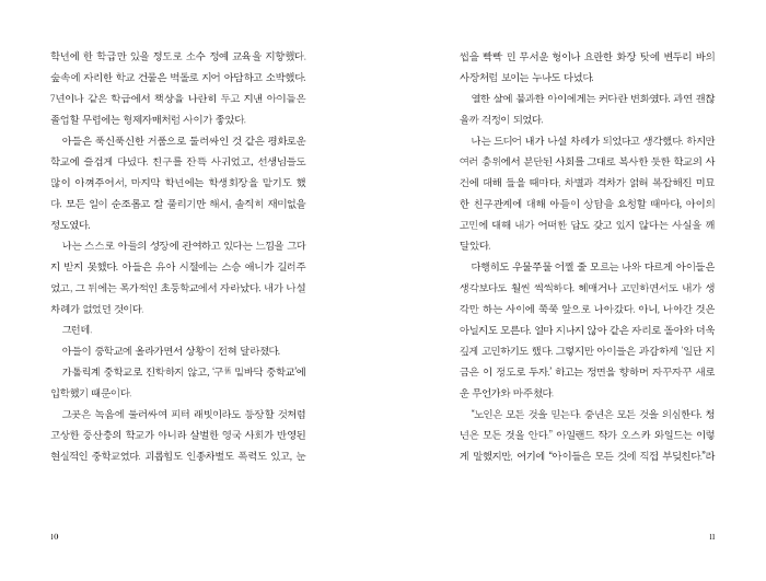 저자는 중학교에 갓 입학한 아들이 인종도 국적도 계층도 다른 친구들을 만나며 겪는 복잡미 묘한 사건을 관찰하며 다양성과 차별이라는 민감한 이슈를 풀어낸다. 긴축 재정과 브렉시트로 분열과 갈등이 심화되고 있는 영국 사회를 배경으로 어른들의 편견을 뛰어넘으며 치열하게 고민하고 성장하는 아이들의 모습이 깊은 감동을 준다.