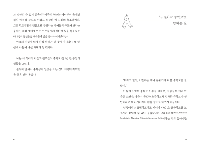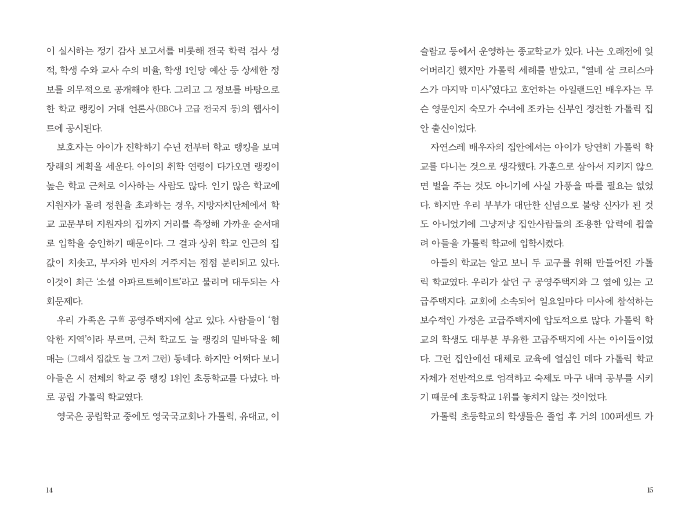P.14―영국에서는 공립학교라도 자녀가 다닐 초・중등학교를 보호자가 선택할 수 있다. (...) 아이의 취학 연령이 다가오면 랭킹이 높은 학교 근처로 이사하는 사람도 많다. 인기 많은 학교에 지원자가 몰려 정원을 초과하는 경우, 지방자치단체에서 학교 교문부터 지원자의 집까지 거리를 측정해 가까운 순서대로 입학을 승인하기 때문이다. 그 결과 상위 학교 인근의 집값이 치솟고, 부자와 빈자의 거주지는 점점 분리되고 있다. 이것이 최근 ‘소셜 아파 르트헤이트’라고 불리며 대두되는 사회문제다.