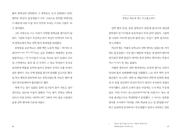 영국 지방도시의 공영주택지가 모여 있는 동네. 겉으로 보기엔 그냥 ‘가난한 동네’지만 실은 공영주택에 거주하는 사람과 공영주택을 구입한 사람, 구입한 공영주택을 최신 유행에 맞게 리모델링한 사람이 섞여 살고 있다. 그 동네 아이들이 다니는 중학교에도 무상 급식 대상자와 중산층, 이민자와 원주민, 백인과 유색인종이 섞여 있다. 저자는 아이가 백인에게 인종 차별을 당하거나 몸집이 작아 폭력을 당할까봐 걱정했지만 차별과 폭력의 양상은 한층 복잡하다. 이민자와 유색인종을 배척하는 건 또 다른 이민자였고, 식당에서 음식을 훔쳐 먹은 친구를 타이르던 아이들이 벌을 내리듯 폭력을 가했으며, 혐오 발언을 일삼던 아이는 ‘쿨하지 않다’는 이유로 집단 따돌림을 당한다. ‘나와 다른 사람’에게 친절과 걱정을 가장한 편견을 내비치고, PC(Political correctness:정치적 올바름)함과 취향의 자유를 근거로 폭력을 정당화한다. 아이들의 철없는 행동이라 치부하기에는 이미 사회 곳곳의 분열과 갈등이 뿌리 깊다. 브렉시트를 둘러싸고 치열하게 대립하는 여론과 이민자에 대한 이중적 태도, 하층 계급을 바라보는 중산층의 차가운 시선 위에 아이들의 전장은 이미 예견된 셈이다. 사립학교와 공립학교의 수영장 풀사이드마저 나뉘어 있는 중학교 수영대회의 모습은 21세기 계급사회의 풍경을 여실히 보여준다.