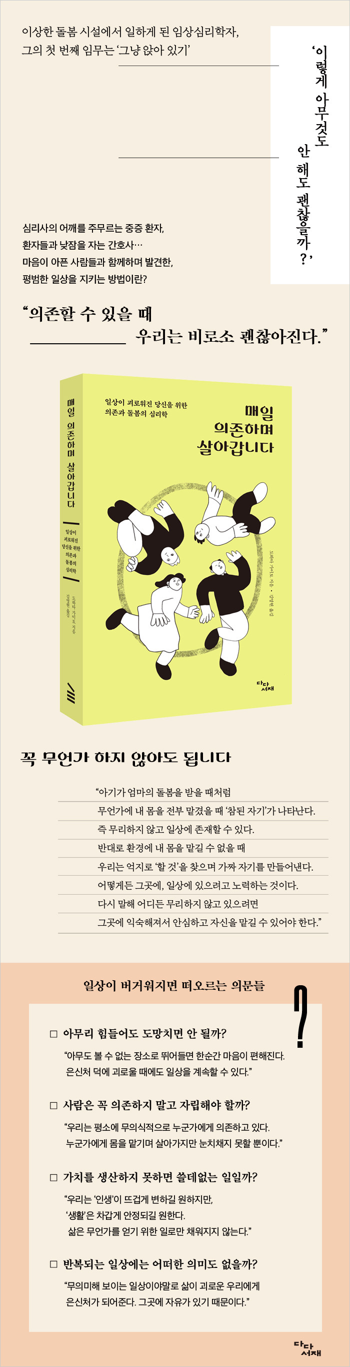 『매일 의존하며 살아갑니다』는 일상의 가치를 돌아보며 평온한 하루하루를 지켜주는 ‘의존’과 ‘돌봄’의 원리에 대해 살펴보는 책이다. 저자 도하타 가이토는 임상심리학자로 정신과 돌봄 시설에서 중증 환자들과 함께 생활하며 ‘반복되는 일상’의 가치를 깨닫는다. 얼핏 보면 별일 없는 듯한 지루한 일상이 실은 우리 삶을 건강하게 떠받친다는 것이다. 저자는 완전히 의존하고 돌봄을 받을 수 있을 때 비로소 일상이 건강히 유지된다고 역설한다. 정신과 돌봄 시설을 배경으로 소설보다 재미있고 감동 넘치는 이야기가 펼쳐지는 이 책은 현대 사회에서 간과되는 것들의 가치를 조명하며 건강한 마음과 삶으로 향하는 또 다른 길을 안내해준다.