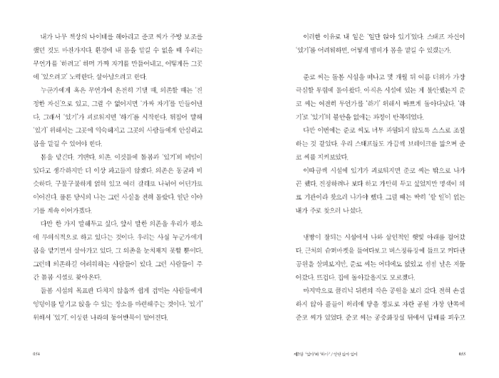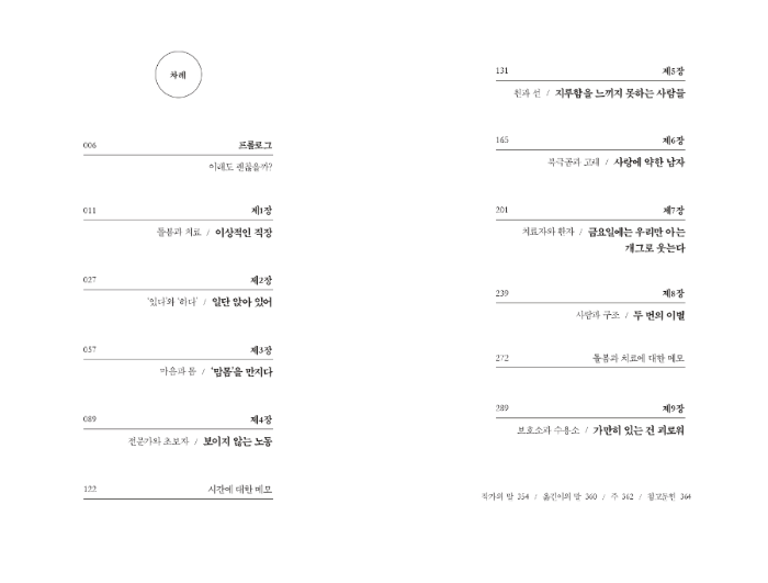하지만 다양한 사정을 지닌 환자들과 교류하고, 베테랑 스태프들과 함께 일하며, 저자는 치료에 앞서 ‘돌봄’으로써 일상부터 복구해야 한다는 것을 깨닫는다. ‘가만히 있기’조차 힘든 사람들과 함께하며 ‘있기’가 우리 삶에 얼마나 중요한지 알게 된 것이다. 그때껏 치료만 신경 쓰던 저자는 ‘돌봄’에 대해 고민하기 시작하고, 치료에도 돌봄을 접목하는 임상심리학을 연구한다.