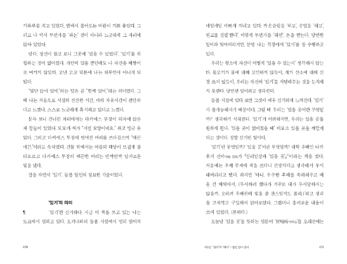바야흐로 ‘무언가 하는 것’이 미덕인 세상이다. 공부든, 일이든, 자기계발이든, 사람들은 무언가 함으로써 빈 시간을 없애고 그 결과 가치를 생산하여 성장하길 바란다. 하지만 그에 따른 부작용도 있으니, 바로 우리 삶의 밑바탕인 ‘일상’이 경시되는 것이다. 나날이 증가하는 우울증 환자, 여전히 높은 자살률 등을 보면 우리 사회에 일상을 유지하는 것조차 힘겨워하는 이들이 얼마나 많은지 알 수 있다.