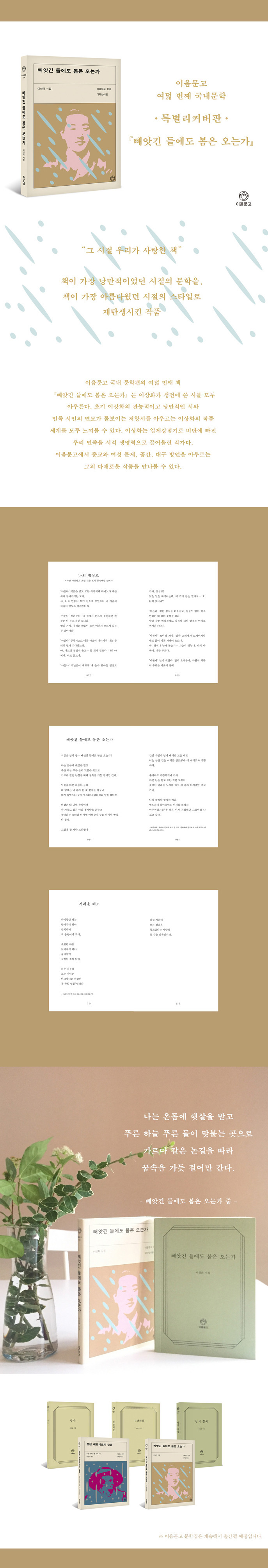 이음문고 국내 문학편의 여덟 번째 책 『빼앗긴 들에도 봄은 오는가』는 이상화가 생전에 쓴 시를 모두 아우른다. 『나의 침실로』와 같은 초기 이상화의 관능적이고 낭만적인 시부터 『빼앗긴 들에도 봄은 오는가』등의 민족 시인의 면모가 돋보이는 저항시, 그리고 회환이 짙게 묻어나는 후기의 『역천』, 『서러운 해조』등의 대표작들을 담고 있다. 이상화는 일제강점기로 비탄에 빠진 우리 민족을 시적 생명력으로 끌어올린 작가다. 이음문고에서 종교와 여성 문제, 공간, 대구 방언을 아우르는 그의 다채로운 작품을 만나볼 수 있다.