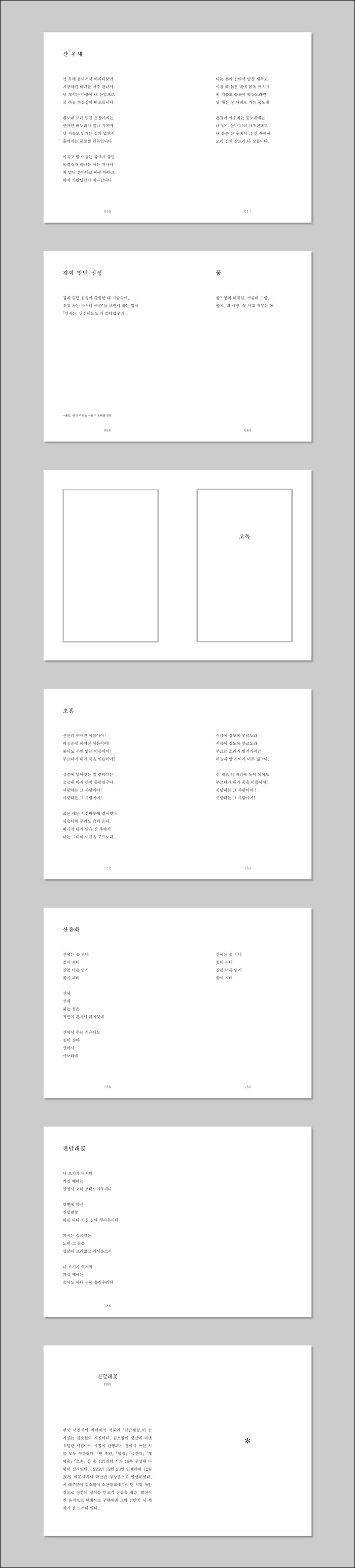 이음문고가 선보이는 다섯 번째 문학은 한국인이 가장 사랑하는 시인 김소월의 <진달래꽃>이다. 김소월이 살아있을 때 엮은 유일한 시집으로 1925년 책 출간 전까지 발표했던 시를 모두 실었다. 한국 서정시의 기념비적인 작품이며 노래로도 만들어져 지금까지도 많은 사람들에게 사랑받는 작품인 <진달래꽃>을 포함한 시 127편이 16부로 구성으로 담겨 있다. 이음문고는 독자들이 김소월의 시심을 온전히 느껴볼 수 있도록 가독성을 해치지 않는 선에서 원문의 표현을 살려 시집을 펼쳐냈다. 오랜 시간 이어져 내려온 우리 고유의 정서를 현대시로 새롭게 탄생시킨 김소월의 시를 만나보자.