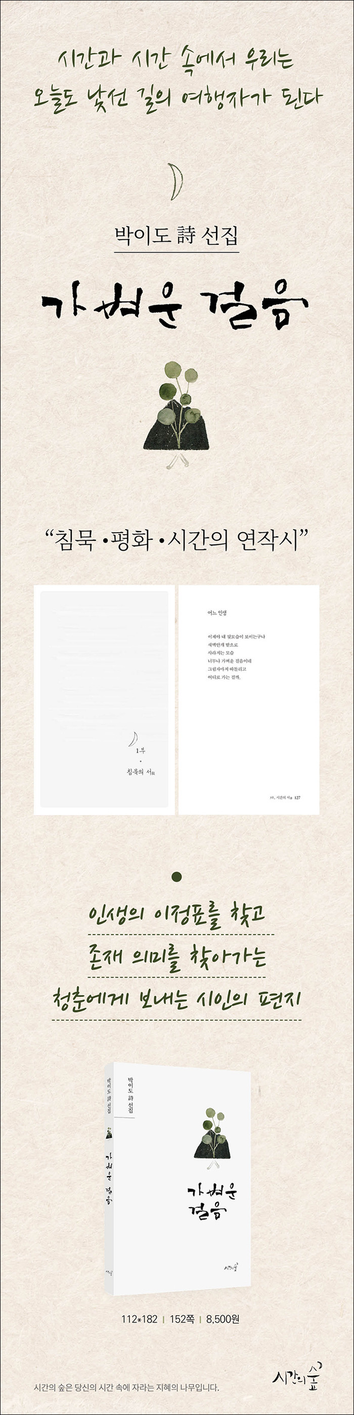 박이도 시인의 시선집 《가벼운 걸음》은 연작시를 중심으로 ‘침묵, 평화, 시간’이라는 세 주제를 담고 있다. 시인은 소외와 절망에 빠져들고 때로는 희열하고 비감하기도 하는 우리의 감성에 가벼운 발걸음으로 다가온다. 우리는 시인이 이성과 감성의 기저에서 존재와 삶을 향해 던지는 화두 속에서 인간의 사랑과 희망, 생명, 자유를 발견하고 경험한다.