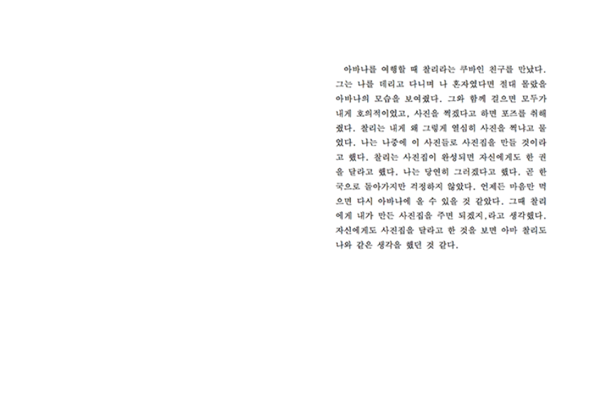 "아바나를 여행할 때 찰리라는 쿠바인 친구를 만났다. 그는 나를 데리고 다니며 나 혼자였다면 절대 몰랐을 아바나의 모습을 보여줬다. 그와 함께 걸으면 모두가 내게 호의적이었고, 사진을 찍겠다고 하면 포즈를 취해줬다. 찰리는 내게 왜 그렇게 열심히 사진을 찍냐고 물었다. 나는 나중에 이 사진들로 사진집을 만들 것이라고 했다. 찰리는 사진집이 완성되면 자신에게도 한 권을 달라고 했다. 나는 당연히 그러겠다고 했다. 곧 한국으로 돌아가지만 걱정하지 않았다. 언제든 마음만 먹으면 다시 아바나에 올 수 있을 것 같았다. 그때 찰리에게 내가 만든 사진집을 주면 되겠지,라고 생각했다. 자신에게도 사진집을 달라고 한 것을 보면 아마 찰리도 나와 같은 생각을 했던 것 같다.” -본문에서