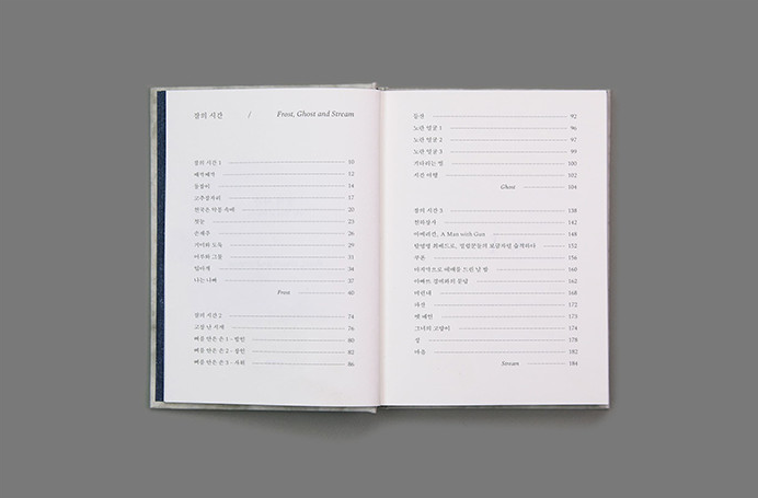 사진집 〈Frost, Ghost and Stream〉은 추운 새벽녘의 서리와 햇빛을 찍은 Frost, 뚝방길 옆 그린벨트 구역의 겨울 풍경을 찍은 Ghost, 양재천과 탄천 근처 한강 하류의 물결을 찍은 Stream으로 구성되어 있습니다.