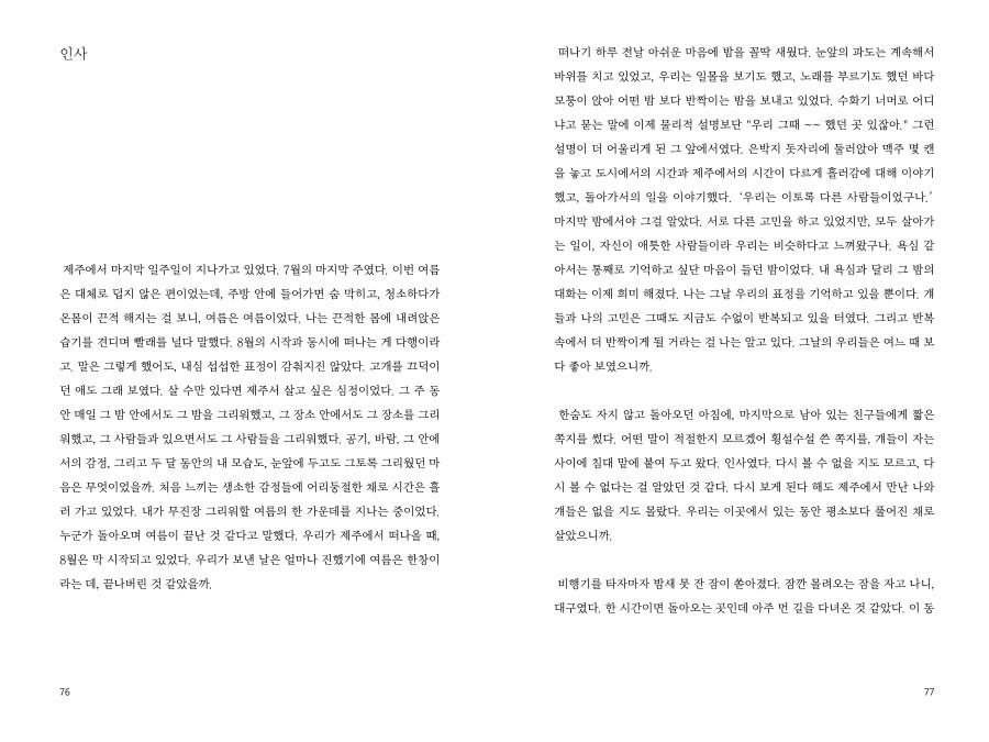 빈센트 그림을 보기 위해서 비행기를 탔던 작가의 순수한 열정을 생각했다. 자기가 본 것을, 다른 이들에게도 너무 보여주고 싶어 그림을 그렸던, 그림밖에 모르던 빈센트의 순수한 열정을 생각했다. 나는 두 순수한 열정을 생각하다, 내가 가진 열정을 생각했다. 모르는 채로 살아갈 수도 있었지만, 알게 된 나의 순수한 열정을 생각했다. 이제는 더 이상 모르는 척할 수 없게 된 어떤 마음에 대해서였다. 쓰는 일에 대해서였다. 191p
