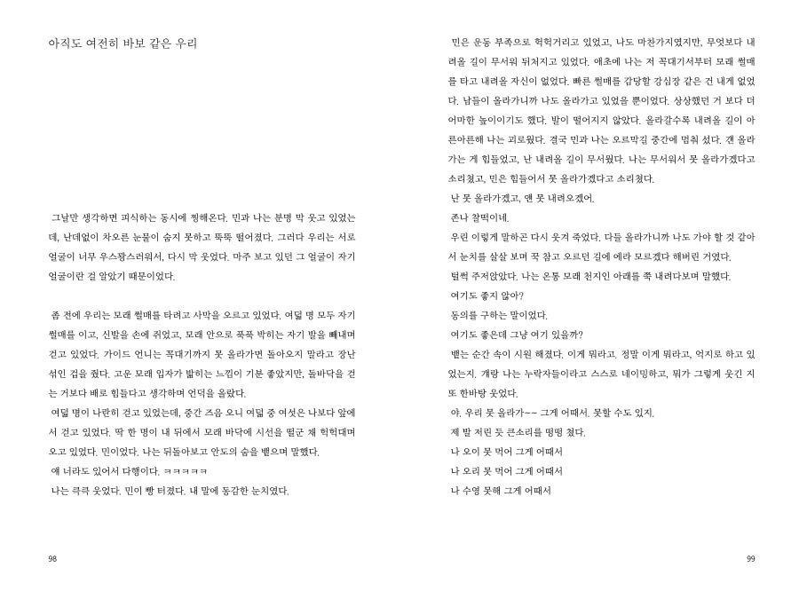 우리는 서로를 궁금해하며, 자기 답도 써 보기 시작했다. 퀴퀴한 냄새가 나던 방 안에서도, 한 밤에 바닷물에 발을 담그고서도, 옥상에 누워 별을 보면서도, 해지는 걸 보던 자리에서도, 어떤 이의 기습으로 혹은 스스로 떠오른 물음으로, 잊고 지내던 질문들을 다시 찾아가고 있었다. 여전히 내가 나를 궁금해했으면 하는 마음이었다. 49P