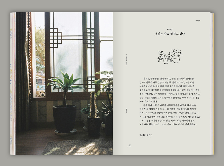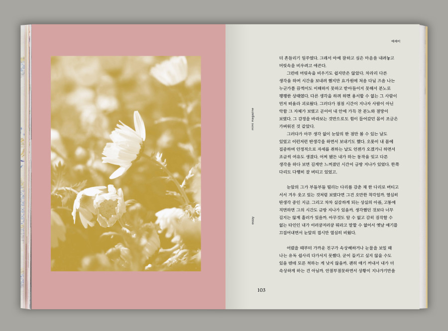 이번 5호의 주제는 <플라워>입니다. 앙상한 나뭇가지에 새순이 돋고 꽃이 제 몸집을 키우는 모습이 그저 자연스럽고 당연한 것으로만 여겼는데 그 안의 시간들에 대해서는 좀처럼 생각하지 못했던 것 같습니다. 아름다운 꽃을 피우기 위해 때로는 슬픔으로, 때로는 희망으로 흠뻑 적셨을 생각을 하면 눈앞의 색색깔의 꽃들이 너무나 대견해집니다. 그리고 생각해봅니다. ‘나도 지금 꽃을 틔우는 중일까?’