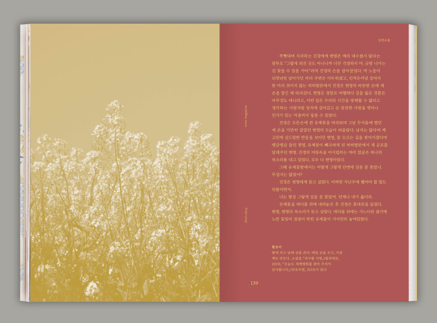 유채꽃이 빼곡하게 핀 허허벌판에서 제 공포를 달래주던 현영. 진경의 머릿속을 어지럽히는 여러 얼굴은 하나의 목소리를 내고 있었다. 모두 다 현영이었다. -단편소설 ⌜유채꽃⌟ 중, 황유미