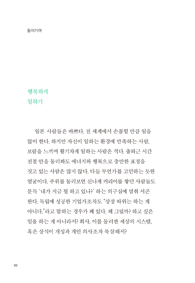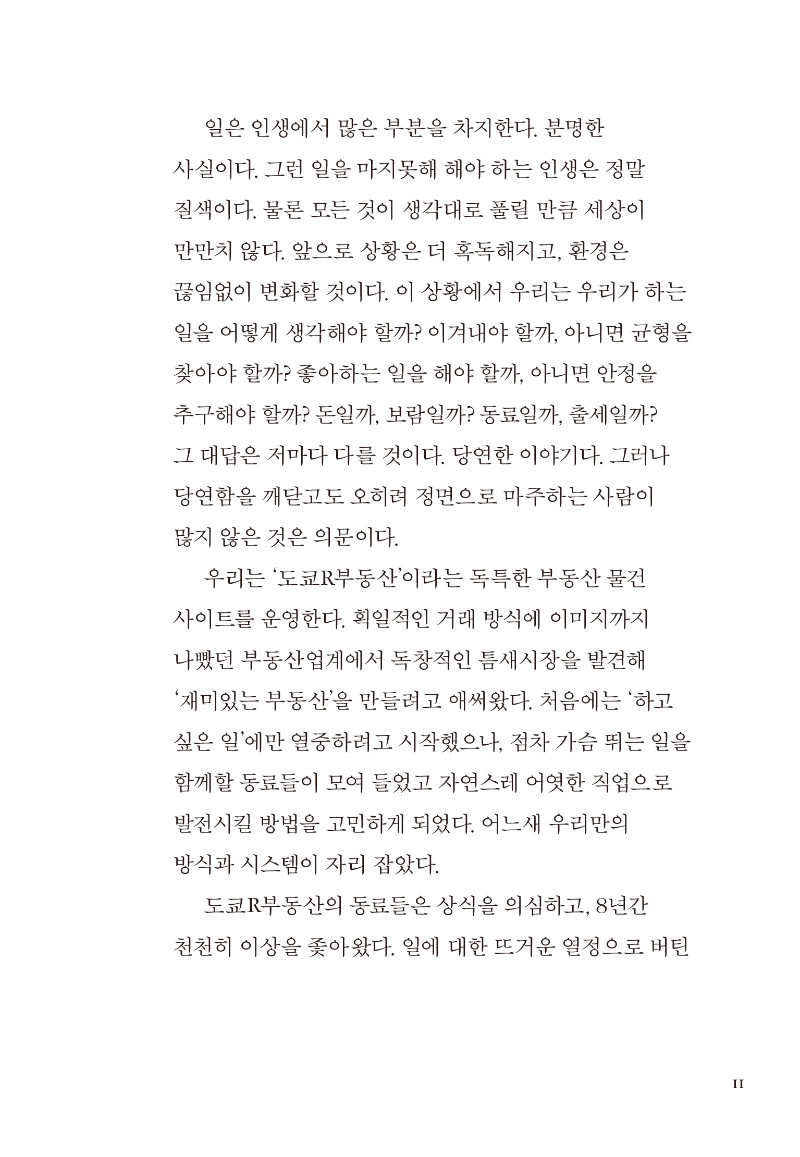 이 책에서 보여주는 도쿄R부동산의 이야기는 행복한 일잘러를 만드는 조직의 일례가 될 수 있다. 그들이 초기에 겪었던 경험과 시행착오는 초기 기업들이 대부분 겪을 만한 것이라서 새로운 조직문화를 필요로 하는 스타트업, 조직문화 쇄신에 고민하는 기업 그리고 그 기업의 구성원들에게 다양한 아이디어를 제공할 것이다. 뿐만 아니라 조직력을 필요로 하는 프리랜서, 1인 기업 등에게는 함께 일하는 방법에 대한 힌트가 될 것이다. 특히 산업간 융합과 콜라보레이션으로 새로운 부가가치를 창출하는 플랫폼 비즈니스는 효율적인 업무 방법, 시스템/구조 등에서 여러 공통점을 찾을 것이다. 나아가 새로운 가치관으로 무장한 세대가 조직 구성원으로 합류하고 기존 세대의 문화와 견고하게 맞서면서 일어나는 직장 내 갈등 조정에도 새로운 해법을 제시할 것이다.