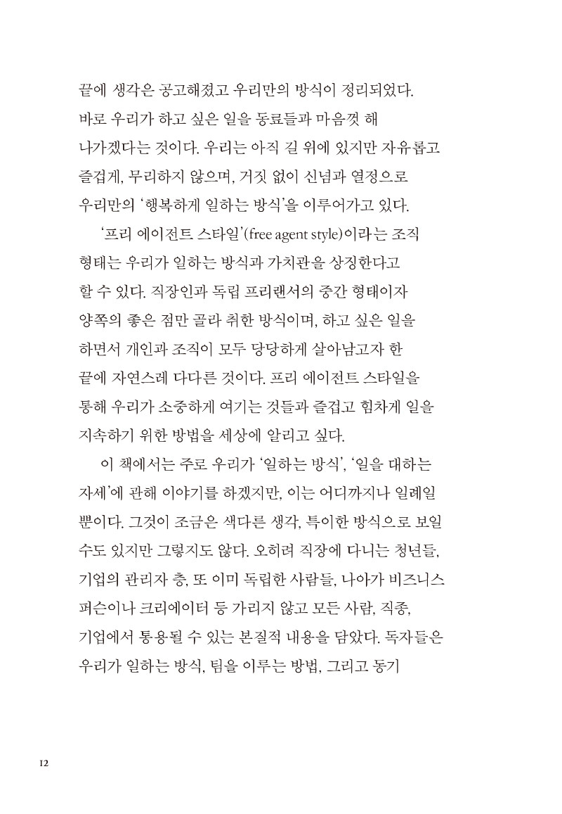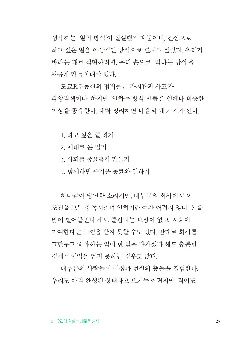 도쿄R부동산은 부동산의 위치나 면적, 시세 등 시장에서 교환될 수 있는 양적 가치 보다는 거주자의 라이프스타일, 공간의 분위기와 매력 등 향유할 수 있는 질적 가치를 중심으로 물건을 소개하고 판매한다. 소위 기존 업계가 도외시했던 틈새시장의 니즈를 발굴한 셈이었다. 하지만 자신들이 하고자 하는 일의 가치와 목표가 기존 업계가 하던 방식으로는 실현하기 어렵다는 것을 깨닫고, 보다 효율적이고 합리적으로 실현할 수 있는 방법을 모색한다. 거듭된 시행착오 끝에 찾은 것이 프리 에이전트 스타일인데, 멤버 한명 한명의 독립적이고 자유로운 활동을 보장하고, 조직 내 소통이 수평적이고 민주적인 구조, 평가와 분배에서 공정한 시스템 등이 체계적으로 마련된다.