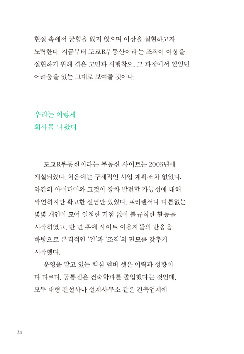 이 책의 저자인 바바 마사타카, 하야시 아쓰미, 요시자토 히로야는 도쿄R부동산의 운영진으로 모두 건축학도 출신이다. 건축과를 졸업하면 일단 건축업계에 진출하는 것에 대해 막연한 거부감이 있었다고 한다. 그리하여 건설사나 설계사무소 같은 곳에 취직하지 않고 색다른 길을 택하고, 각자 평범한 직장인의 삶을 살다가 조금씩 다른 계기로 다시 만난다. 여기에 디자인 출신의 2인이 합세해 태어난 것이 도쿄R부동산이다.