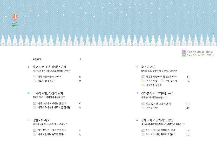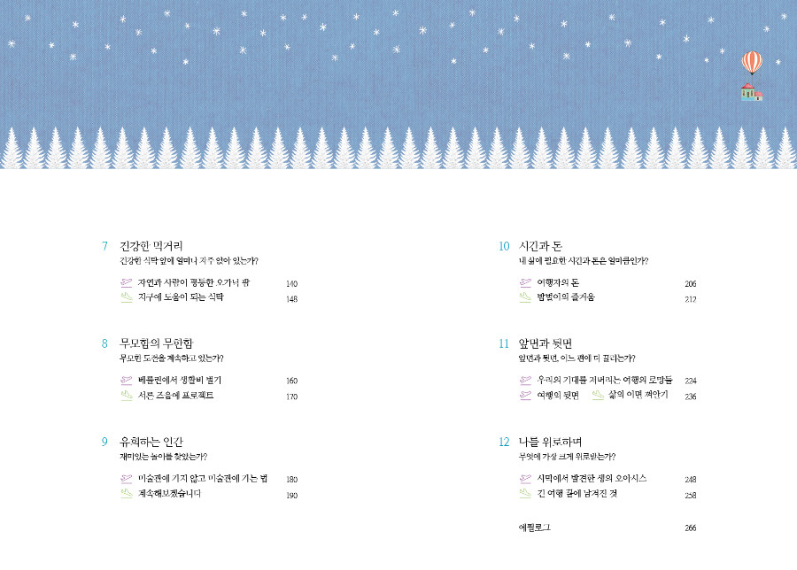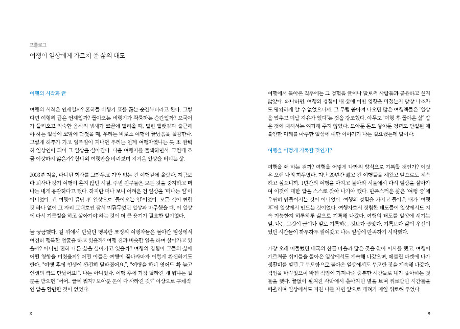 (‘여행의 기록’과 ‘일상의 기록’이 번갈아 나온다. 그 중심에는 일상을 변화시킨 12가지 ‘여행의 태도’가 있다.)