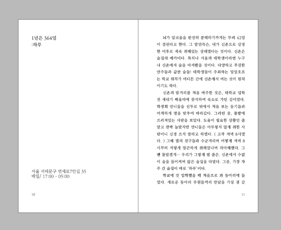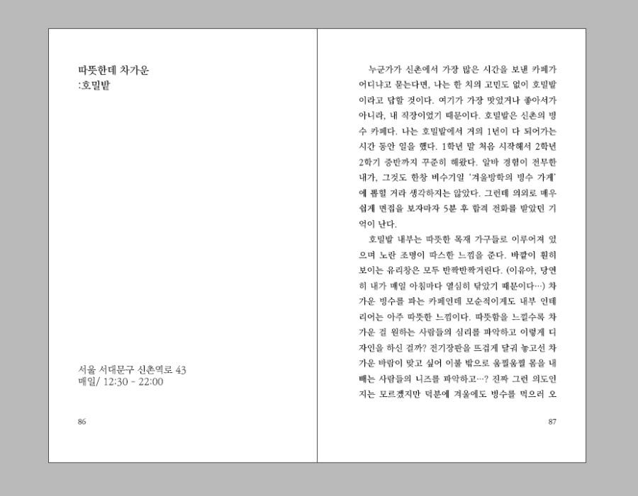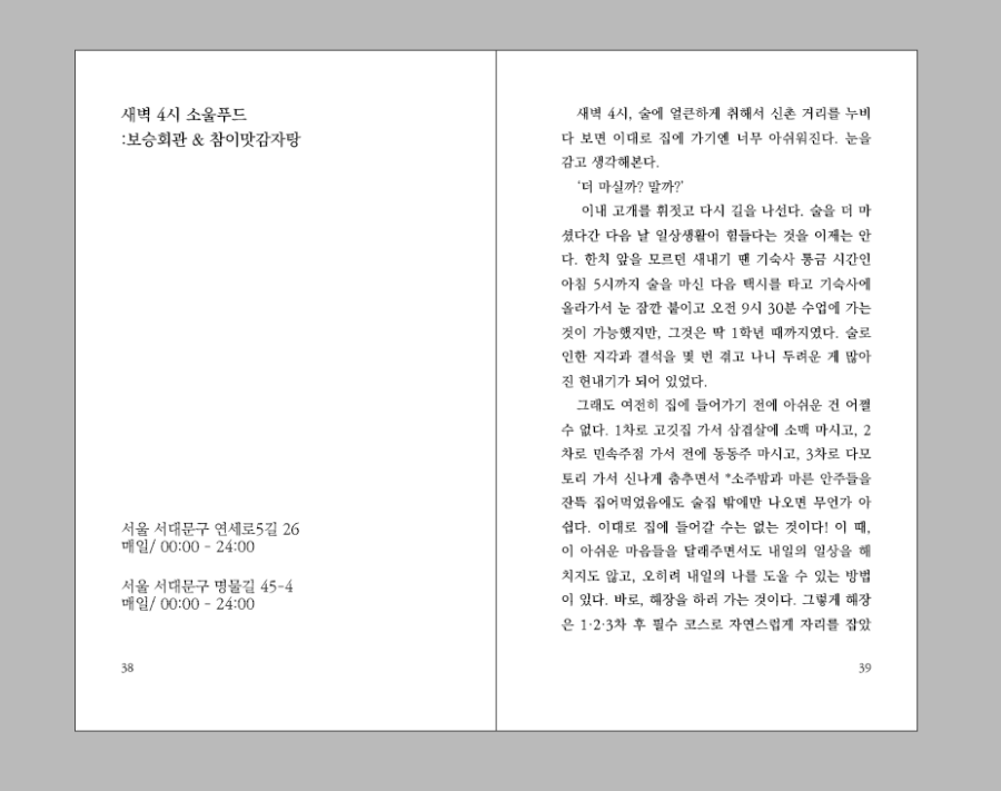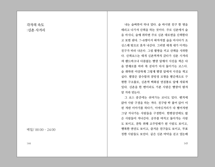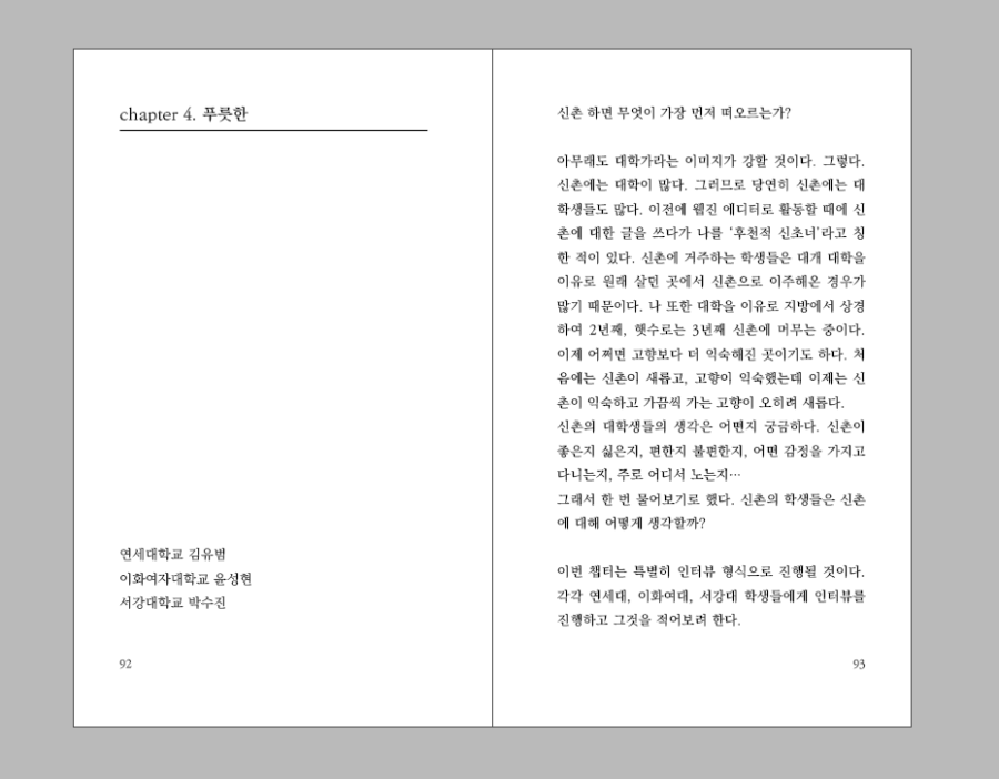 마음에 드는 이와 함께 술 한잔을 했던 곳, 일이 잘 안 풀려서 정처없이 걷다가 우연히 들렸던 꽃집, 혼자서 가기 딱 좋은 조용한 와플 가게, 주3회 출석도장을 찍던 마라탕 집, 취하면 무작정 걷는 버릇 탓에 밤산책을 수없이 했던 신촌 사거리까지...각양각색의 신촌의 장소 20곳에 대한 이야기가 담겨있습니다. 더불어 술버릇부터 사소한 취향까지 아주 사적인 이야기들이 듬뿍 적혔습니다. 신촌에 대한 다른 이들의 생각은 어떨까 싶어 3명의 신촌 대학생 인터뷰도 함께 담아보았습니다.