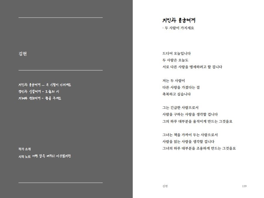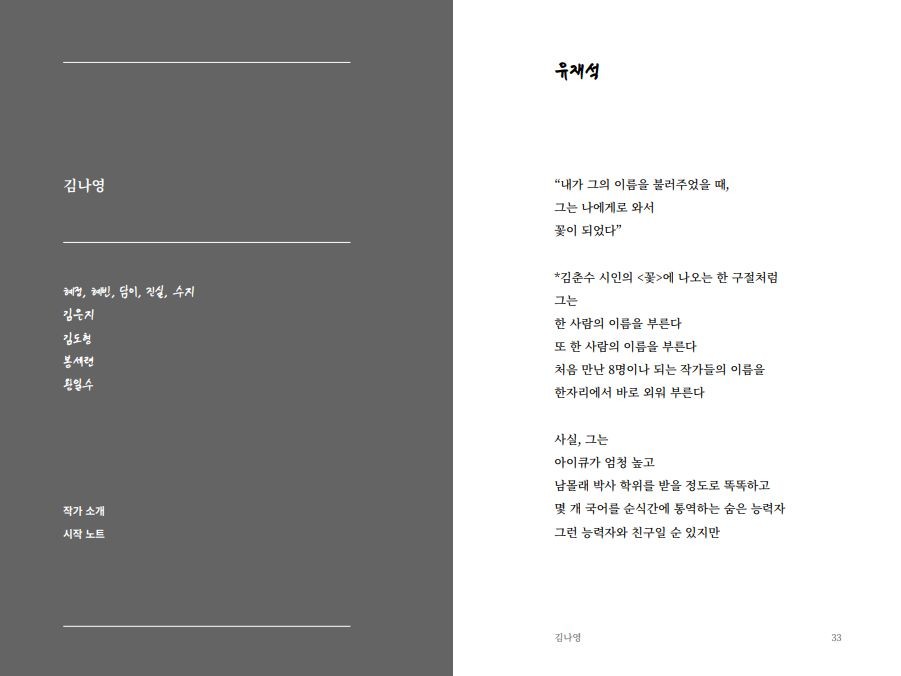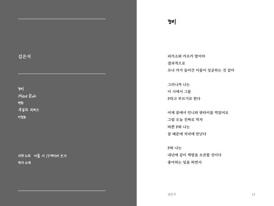 작은 방에서 함께 시를 읽는 것, 본 적 없는 상자에 대해 이야기를 나누는 것, 시를 쓰는 마음을 좋아합니다.
