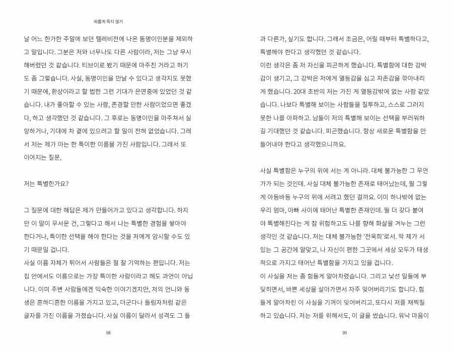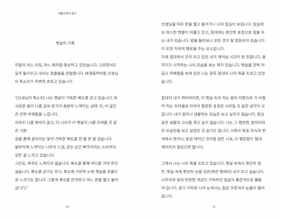 죽음 앞에서 외롭지 않기를, 삶에 미련이 남지 않기를. 그렇게 존재하기 위해 적어 내려간 글들이다.