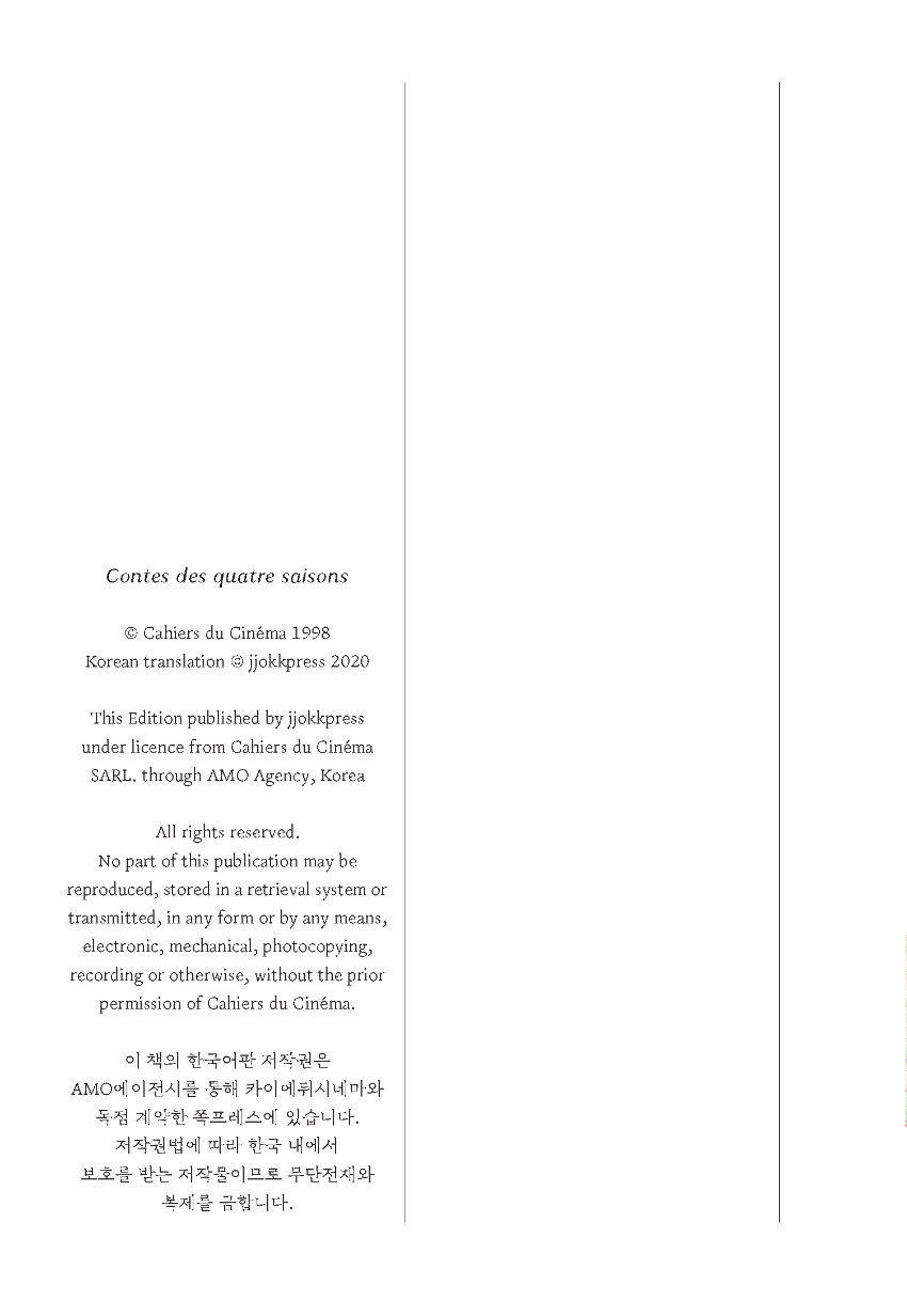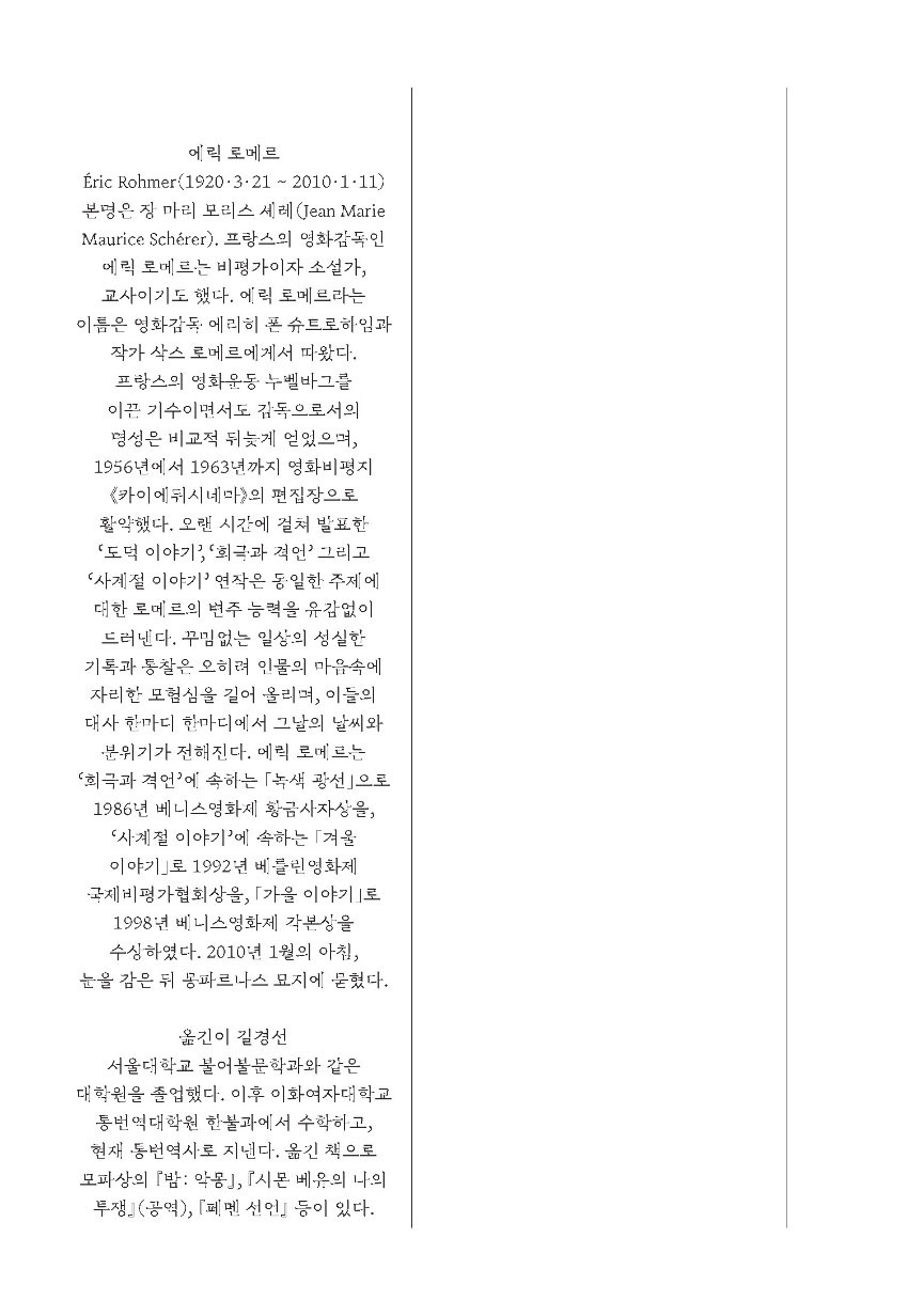 『사계절 이야기』는 올해로 탄생 100주년이자 10주기를 맞는 영화감독 에릭 로메르의 대표작 사계절 연작의 각본집이다.