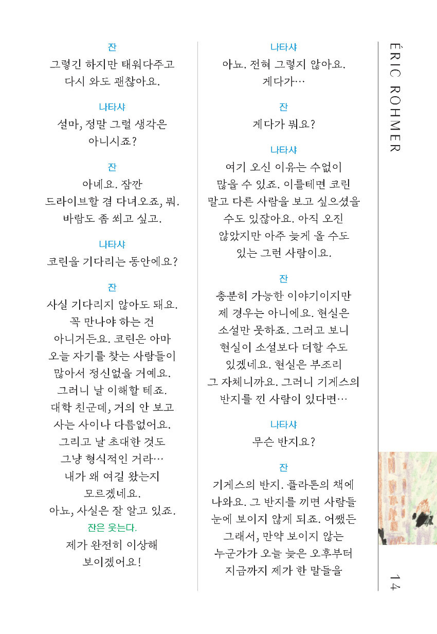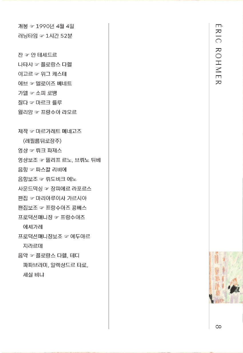 스트리밍서비스는 물론 극장 상영도 드문 에릭 로메르 감독의 영화를, 원하는 페이지에서 멈춰 각자에게 알맞은 속도로 감상할 수 있는 책의 형태로 만나볼 특별한 기회가 될 것이다.