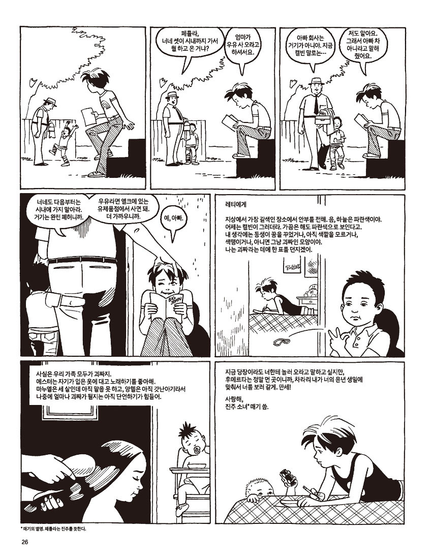 엔딩크레디트가 올라가는 영화를 지켜보듯, 우리는 가까운 사람이 말해준 사실만을 보고, 마치 영화관객처럼 이들의 삶이 피어오르고 무너져내리는 것을 지켜볼 수밖에 없기도 하다. 하지만 한 사람의 생에서 기승전결을 읽어내고, 내 일이라도 된 양 함께 아파하고 희열을 나눌 수 있는 것 역시 주변인이기에 가능한 것임을 이 만화책은 말해준다. 주변인이자 주인공인 인물들의 가여운 시행착오를 보여주는 그래픽노블 『사랑에 서툰 사람들』은 가장 자전적인 매체의 온기를 전해준다.