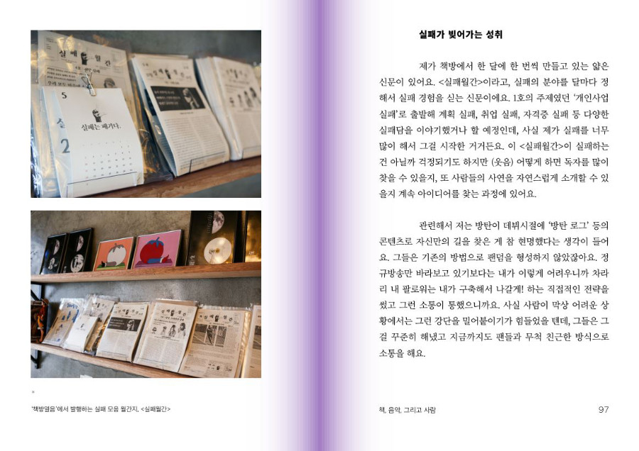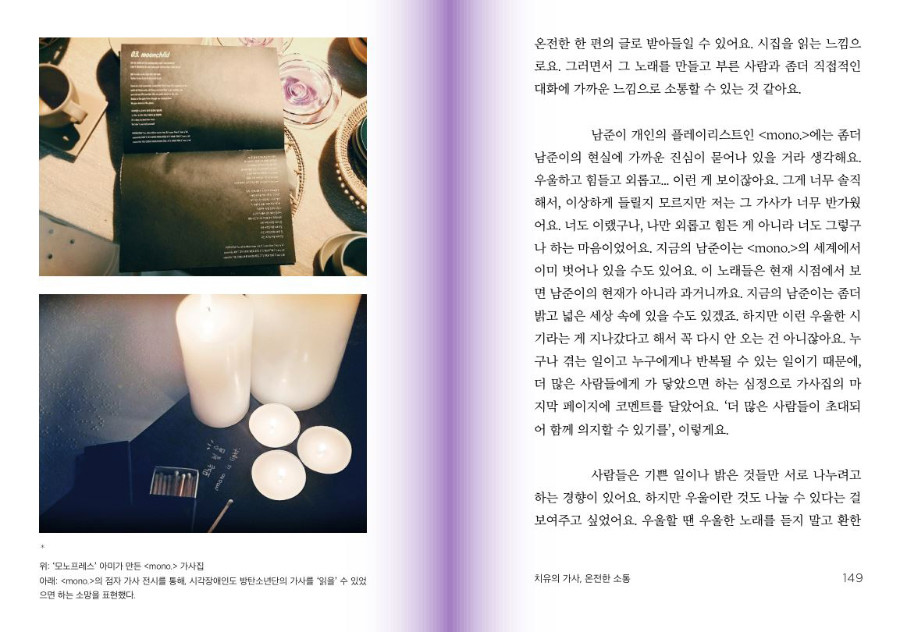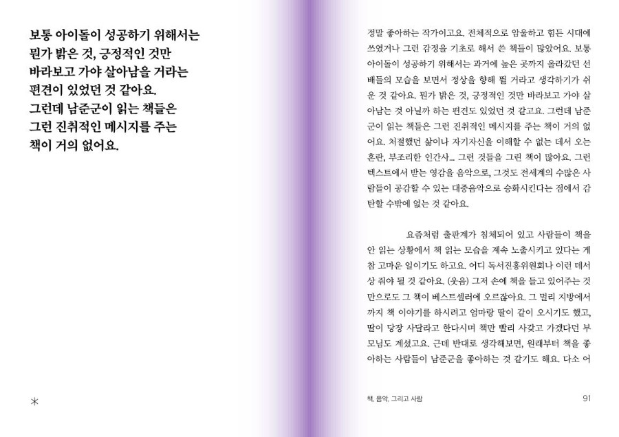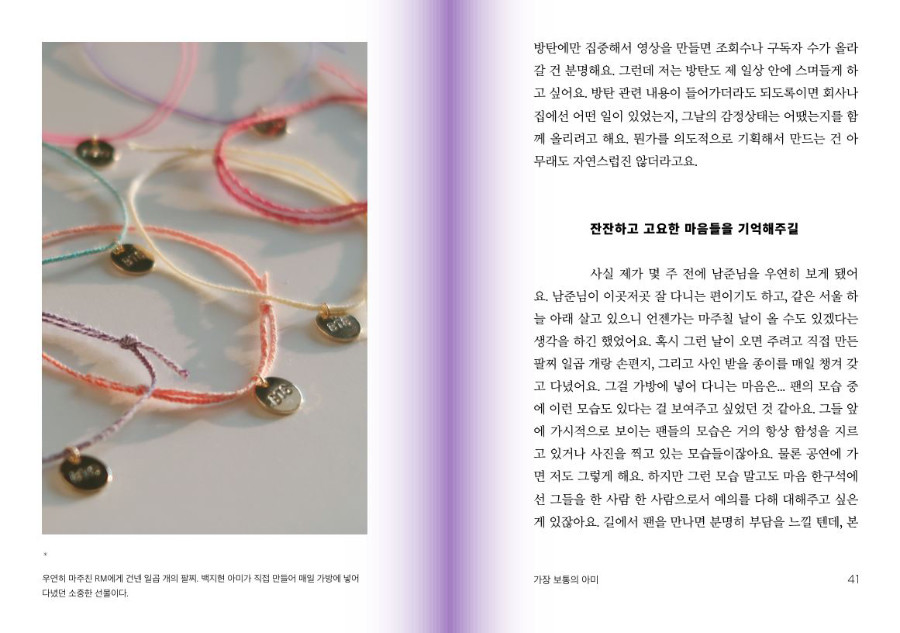"방탄은 항상 ‘나’로 시작을 하는데 그 끝에는 ‘우리’가 있는 것 같아요. 노래를 통해 끊임없이 해오고 있는 나 자신에 대한 이야기가 어느 순간 남을 향한 이야기로 바뀌어 있다는 생각을 하거든요. 책방을 하면서도 느끼는 건, 언제나 사람이 전부라는 거예요."