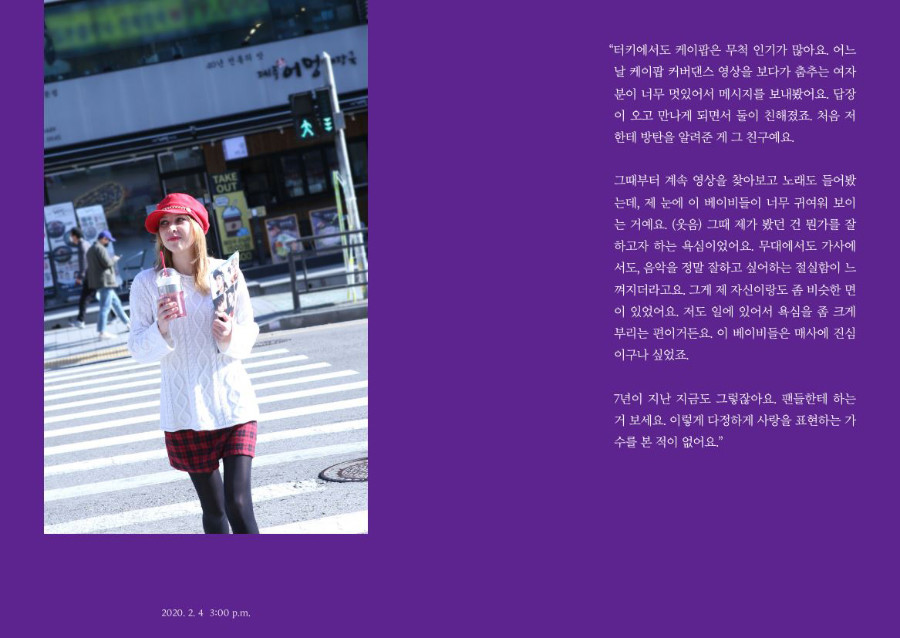 "제 의지에 따라 떠나온 것이긴 하지만, 가끔은 그 복잡하고 지긋지긋했던 서울이 그리울 때가 있어요. 그럴 때 저는 남준이의 곡 ‘seoul’을 들어요. 20대 중반의 나이에 어떻게 그런 가사를 썼을까요? 싫어서 떠나왔지만 결국 또 그리워지고 마는, 많은 사람들이 서울에 대해 품고 있을 그 이중적인 감정이 너무나 잘 담겨있는 거예요. 그 노래를 들으면서 얼마나 많이 울었는지 몰라요."