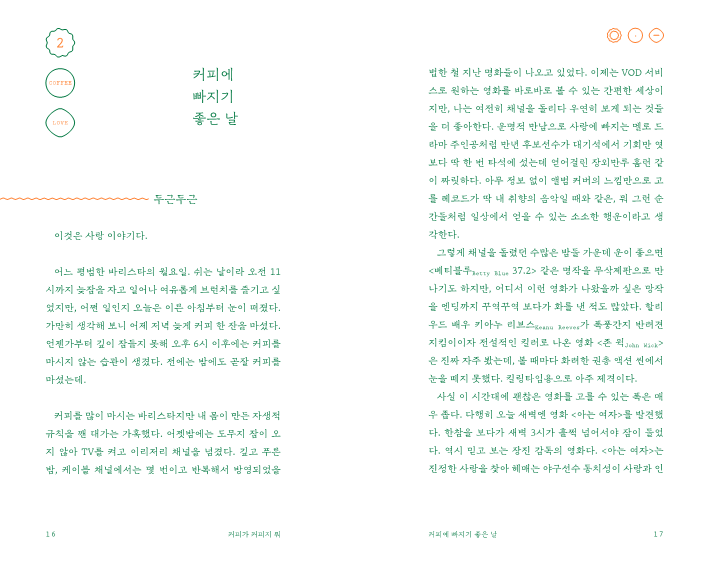확실히 이것은 첫사랑, 풋풋한 냄새 가득한 연애 소설 같은 사랑 이야기다. - 24페이지, '커피에 빠지기 좋은 날' 중
