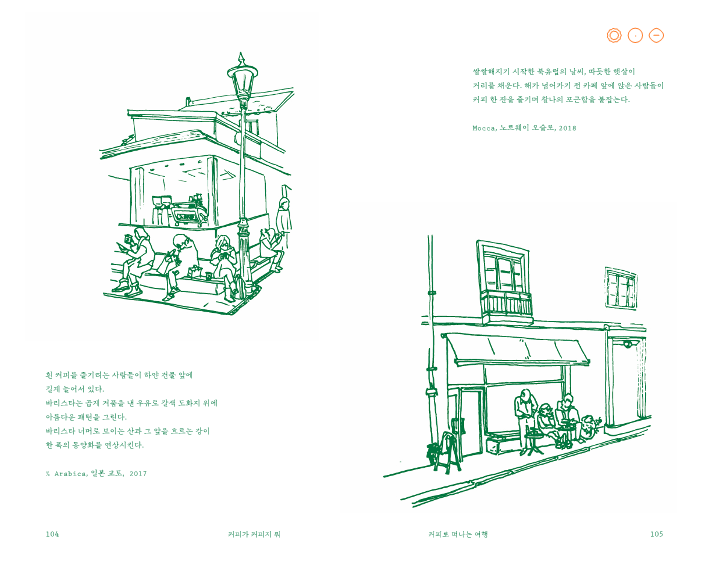 가까운 일본부터 스페셜티 커피의 흐름을 이끈 미국을 거쳐, ‘노르딕 로스팅’을 경험하고자 떠난 두 번의 북유럽 여행까지. 저자들이 사람과 커피, 그리고 도시를 만나며 한 잔의 커피에 감동하고, 새로운 아이디어를 찾아 나서고, 자신의 한계에 낙담하기도 위로받기도 하며, 그렇게 앞으로 나아갈 힘을 얻은 모든 순간들을 전합니다.