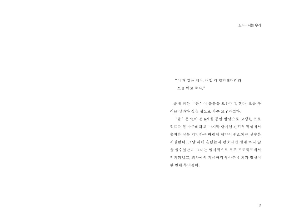 09 꼬꾸라지는 우리_ 12 그리움을 대하는 방법_ 16 최선을 다해 외면하거나 혹은 아파하거나_
