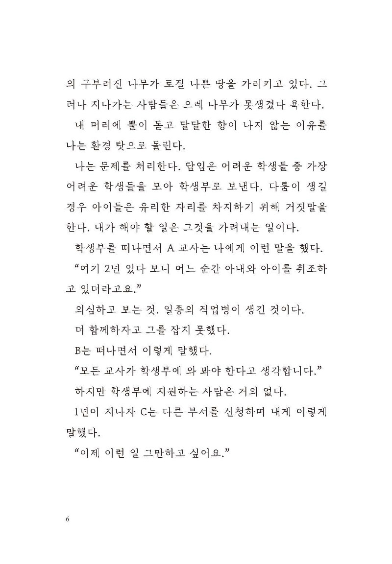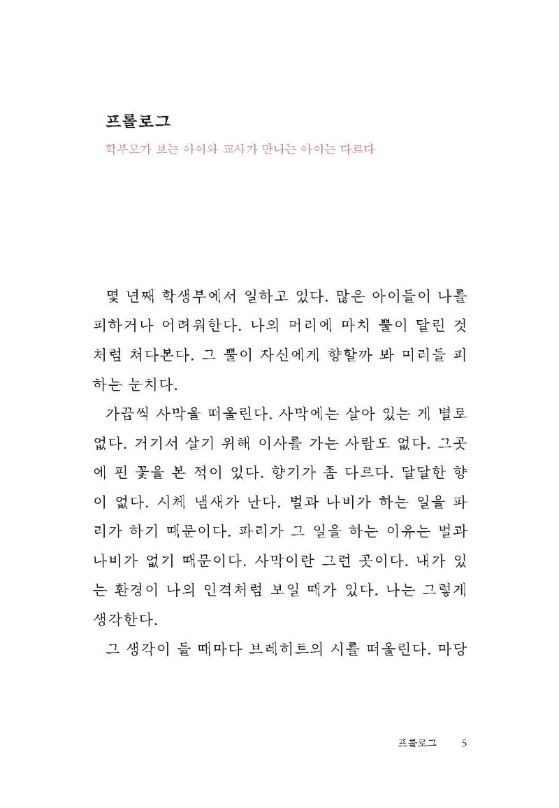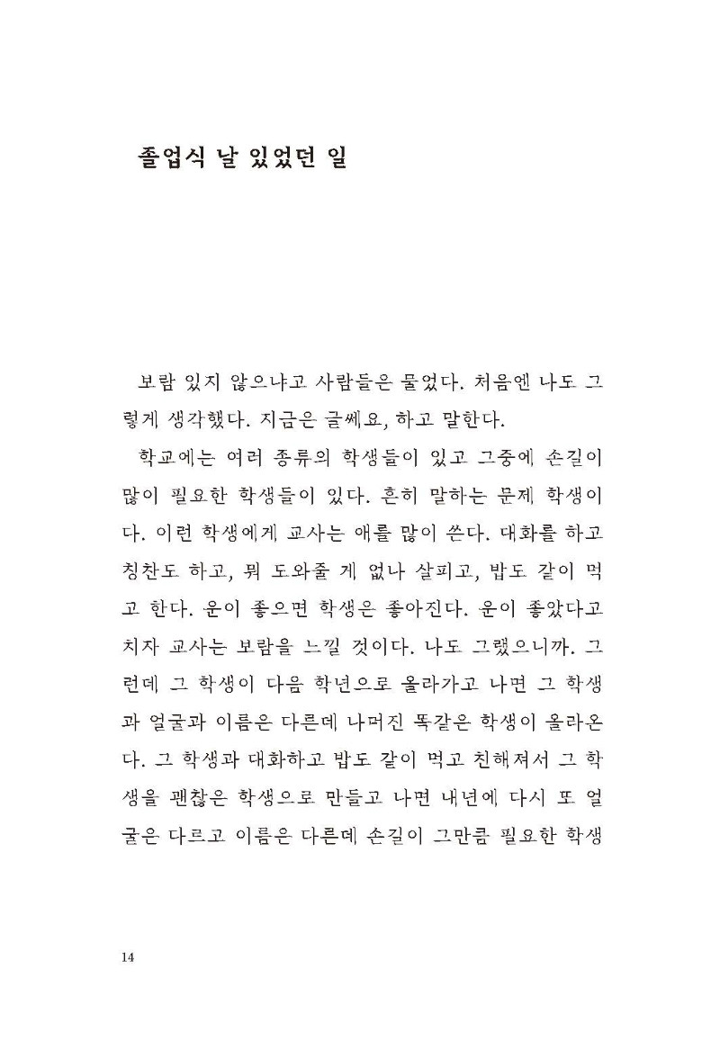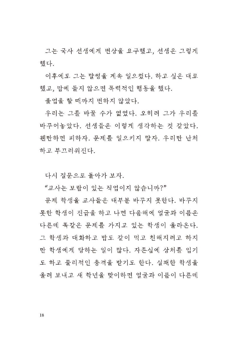 “교사는 보람이 있는 직업이지 않습니까?”라는 화두로 시작하는 이 에세이는 아름다운 곳으로만 생각되는 ‘학교’의 다른 이면을 실화를 바탕으로 재구성하였다. 평화로워 보이는 학교는 교사에게는 ‘전쟁터’와도 같은 곳이다. 말하기 부끄러워 감춰지거나 잘 드러나지 않은 사건과 경험들을 통해 우리가 생각해봐야 할 것은 서로의 입장을 객관적으로 바라보며 아이들이 자라나는 작은 사회인 ‘학교’를 새롭게 인식해야 한다는 점이다.