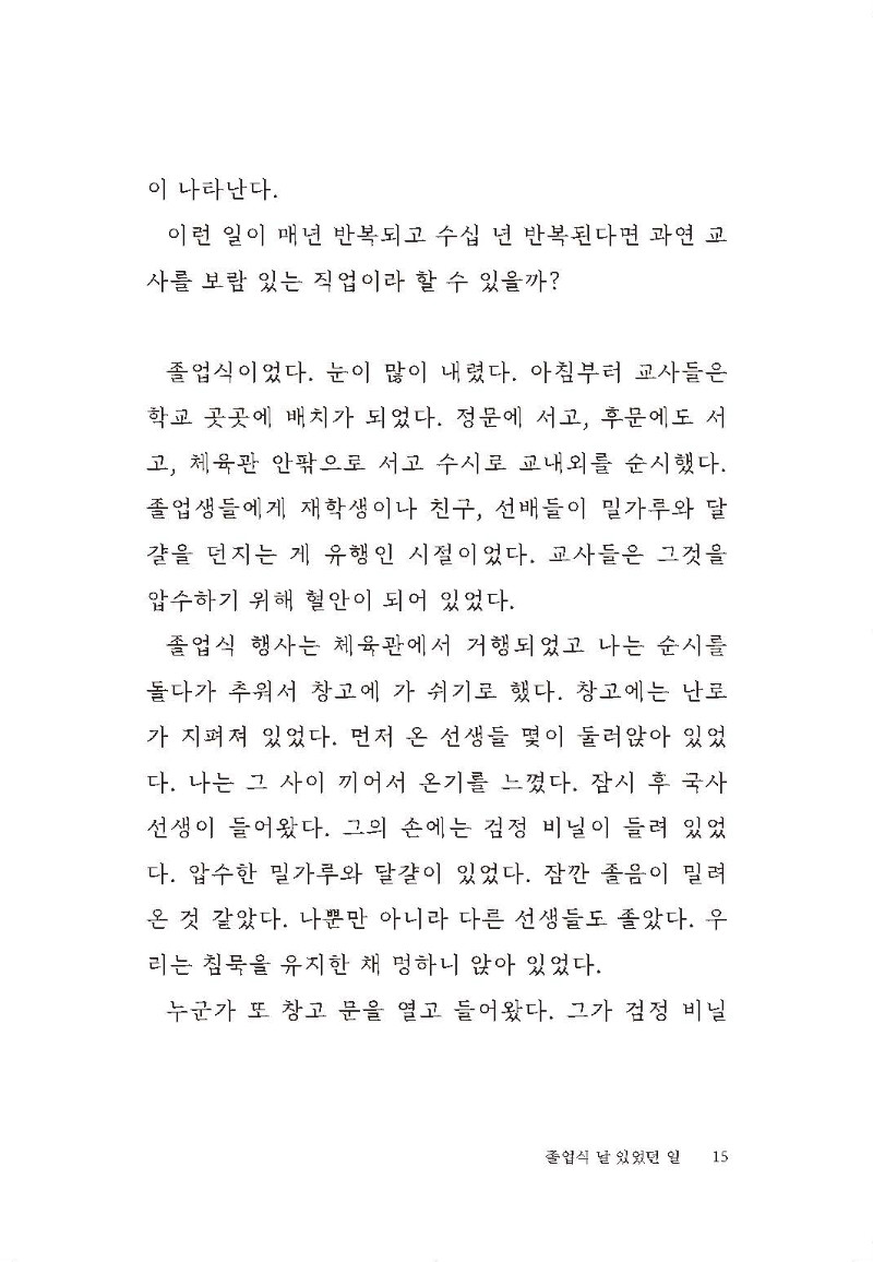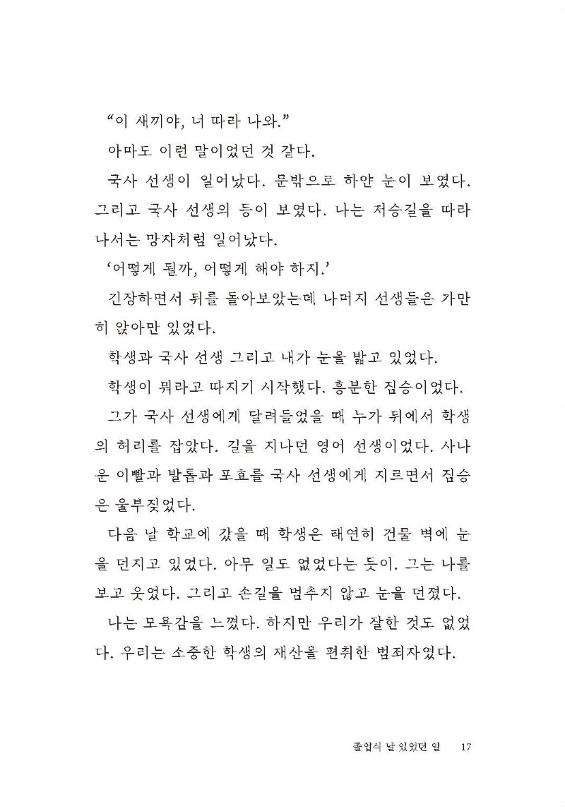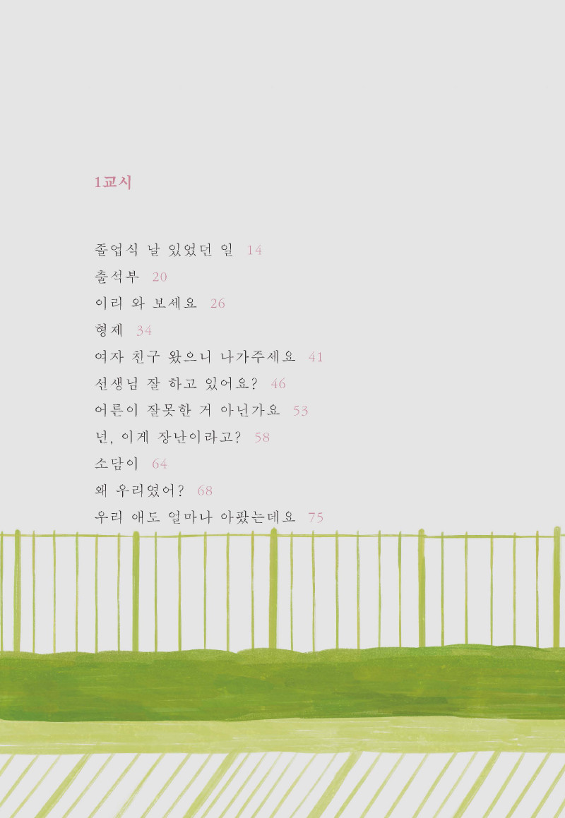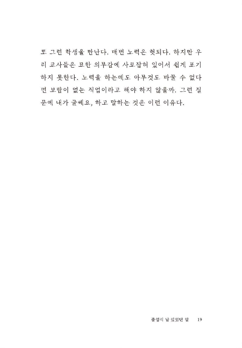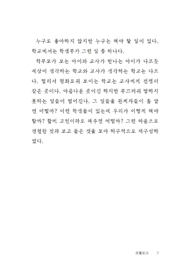 “교사는 보람이 있는 직업이지 않습니까?”라는 화두로 시작하는 이 에세이는 아름다운 곳으로만 생각되는 ‘학교’의 다른 이면을 실화를 바탕으로 재구성하였다. 평화로워 보이는 학교는 교사에게는 ‘전쟁터’와도 같은 곳이다. 말하기 부끄러워 감춰지거나 잘 드러나지 않은 사건과 경험들을 통해 우리가 생각해봐야 할 것은 서로의 입장을 객관적으로 바라보며 아이들이 자라나는 작은 사회인 ‘학교’를 새롭게 인식해야 한다는 점이다.