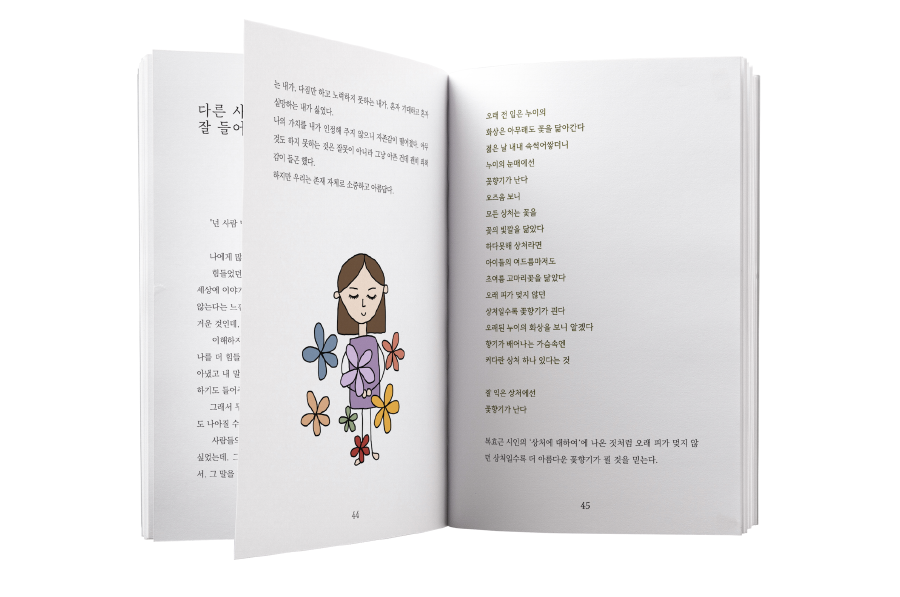하지만, 제가 저의 이야기를 꺼내 놓으니 너도 나도 자신들의 아픔을 공유하기 시작했습니다. '나'의 이야기는 '우리'의 이야기가 되었고, 공감은 곧 위로가 되었습니다. 자신이 힘듦을 숨길 필요는 자신이 힘듦을 숨길 필요는 없습니다. 치료의 시작은 나 자신을 바로 알고 바라봐 주는 데에서 비롯되니까요.