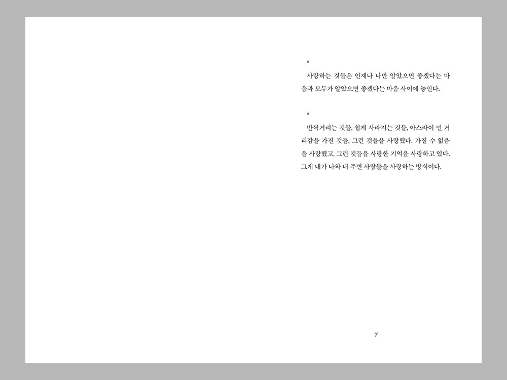 “사랑하는 것들은 언제나 나만 알았으면 좋겠다는 마음과 모두가 알았으면 좋겠다는 마음 사이에 놓인다.”
